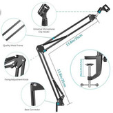 استند نگهدارنده Professional از متریال باکیفت فلز و پلاستیک ساخته شده که استحکام کافی را در برابر آسیب های احتمالی خواهد داشت و دوام این محصول را برای استفاده در طولانی مدت فراهم می کند. هولدر این نگهدارنده متناسب برای استفاده با انواع میکروفون های موجود طراحی شده است که قادر به تحمل وزن سنگین نیز می باشد و از افتادن آن جلوگیری خواهد کرد. این پایه دارای گیره بسیار مقاومی می باشد که به میز یا دیگر وسایل بسیار محکم متصل می شود و با قابلیت ضد لغزش صدایی باکیفیت و شفافی را پخش و ضبط می کند. بازوهای به طول ۷۰ سانتی متر کاملا انعطاف پذیر و با قابلیت تاشو از چند ناحیه به شما امکان می دهند آن را به راحتی با خود حمل کرده و زاویه و ارتفاع مناسب را برای ضبط صدای عالی حتی بر روی سطوح ناهموار تنظیم کنید. این پایه میکروفون با کارایی عالی که به همراه دارد در استودیوها، ایستگاه های رادیویی و تلویزیونی، ضبط پادکست و … بسیار مورد استفاده قرار می گیرد.