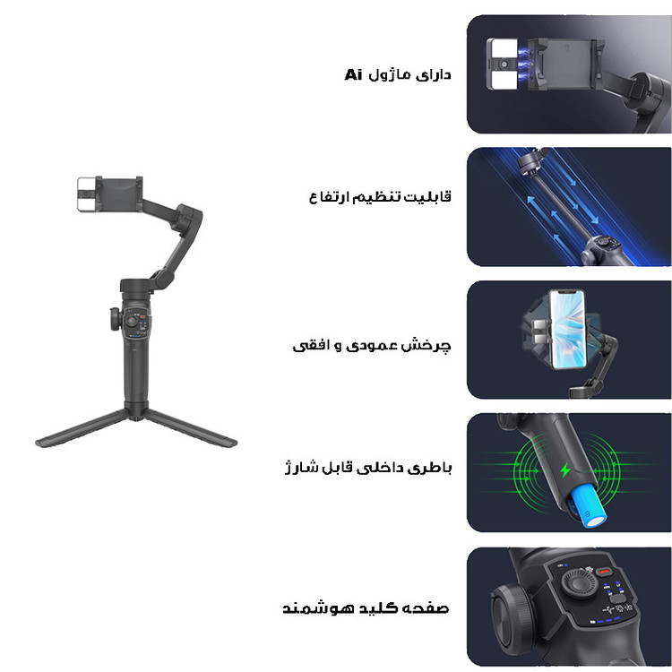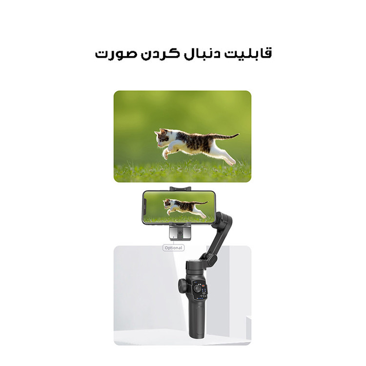 سایر مشخصات: دارای APP ، ولتاژ : 5V ،محور چرخش تا 340 درجه مناسب برای گوشی های هوشمند (از 60 تا 86 میلی متر عرض) و تا 250 گرم اتصال: بلوتوث دارای سه پایه مناسب برای سطوح صاف دارای یاطری با عمر طولانی ، دارای قابلیت تشخیص چهره ، مناسب برای گوشی های اندروید و IOS