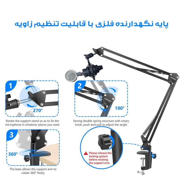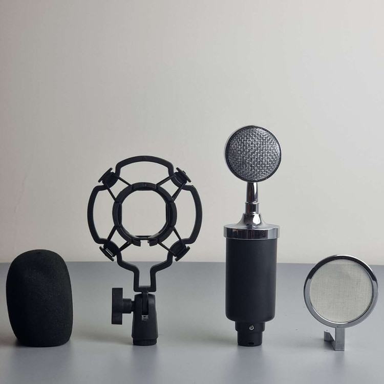 این کیت میکروفون استودیویی، علاوه بر میکروفون، شامل یک استند تاشوی فلزی برای قرار دادن میکروفون روی میز، یک عدد پایه میکروفون ، یک گیره فلزی برای پایه، یک ضدلرزش و یک کیس فلزی است. این میکروفون با طراحی زیبا و سری فلزی یک میکروفون با الگوی قطبی کاردیود است از قابلیت های این میکروفون کاردیودی بیشترین حساسیت را به صدایی که از جلو می آید دارد. صداهای اطراف با شدت کمتری ضبط می شوند و صدای پشت به خوبی حذف می شود. این دقیقاً چیزی است که ما اکثر اوقات می خواهیم، به همین دلیل اکثر میکروفون های استودیو و صحنه الگوی کاردیوید دارند. میکروفون های کاردیوید برای ضبط صدای خواننده و هر چیزی که باید صدایی خشک و نزدیک داشته باشد عالی هستند. فرکانس این میکروفون نیز در محدوده ی 20Hz تا 20kHz می باشد که هم مناسب صدای ساز و موسیقی می باشد و هم مناسب برای تولید پادکست است .