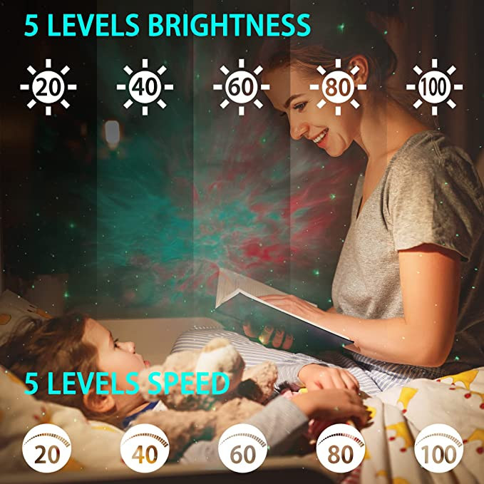 دارای نور شب، دکوراسیون، هدیه، جشن و نورپردازی خلق و خو است 5 سطح روشنایی سحابی، سرعت تغییر سحابی 4 دنده دارد کنترل از راه دور حالت های نور چندگانه، شما می توانید به دلخواه 360 درجه بگردانید. دارای طراحی فضانورد مورد علاقه کودکان می باشد.