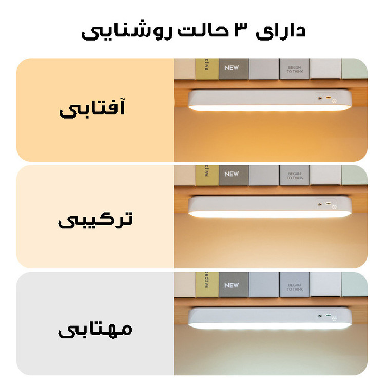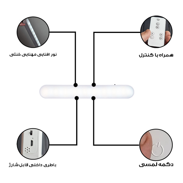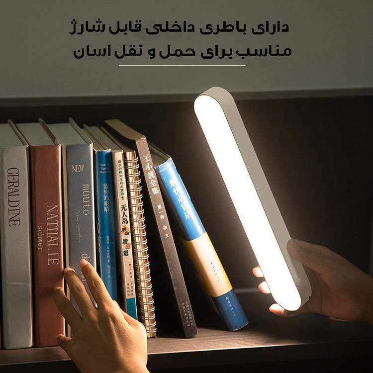 چراغ شارژی قابل حمل ، دارای دکمه لمسی ، دارای ریموت کنترل ، رنگ های افتابی مهتابی خنثی ، و قابلیت تنظیم شدت نور