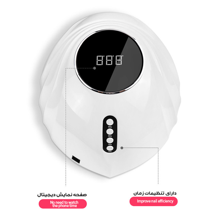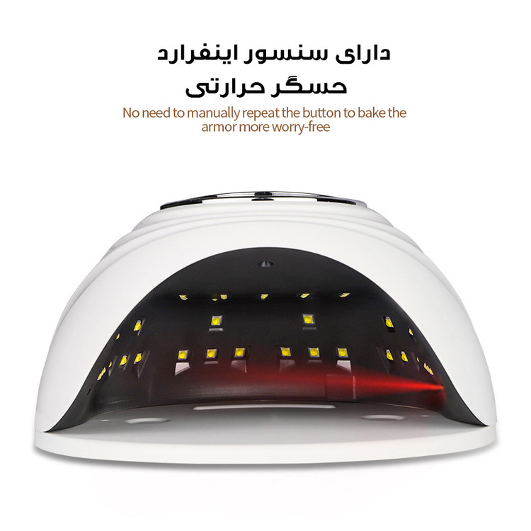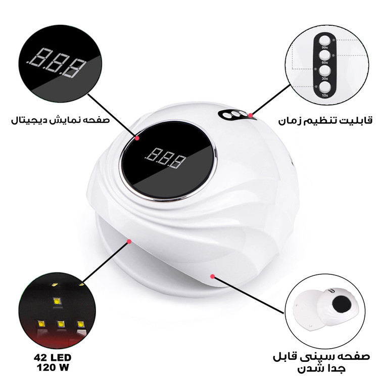 تعداد لامپ ۴۲ عدد با توان ۱۲۰ وات تعداد بالا و چیدمان اسمارت لامپ ها /سنسور حرکتی/ توانایی خشک کردن انواع ژل /صفحه نمایش دیجیتال /سینی کف با قابلیت جدایی /سنسور حرکتی ( به محض ورود دست در دستگاه، لامپ ها روشن میشوند ) تعداد بالا و چیدمان لامپ هوشمند که به بهترین نحو ژلیش و کاشت ژل شما را خشک کند/ قابلیت خشک کردن انواع پلی ژل ها