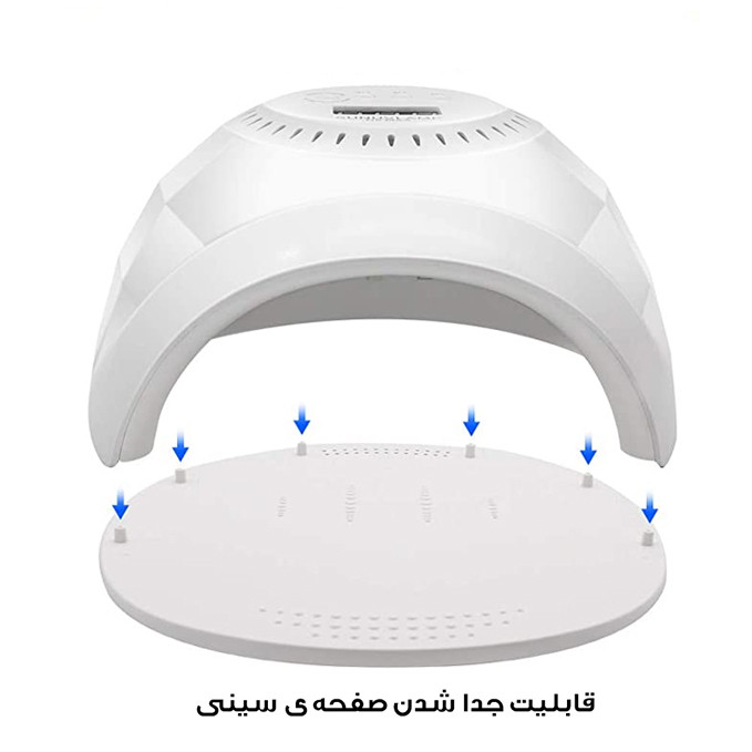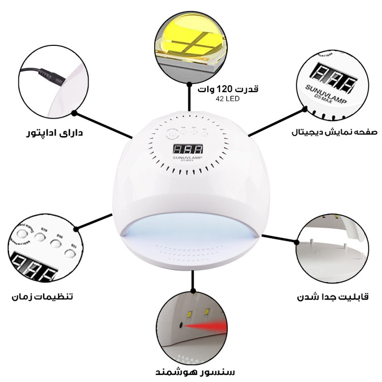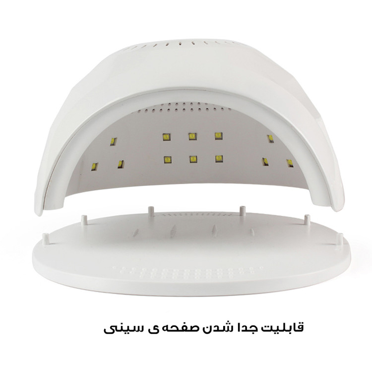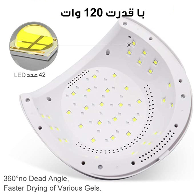 حالتی به نام LOW HEAT MODE دارد که مناسب خشک کردن کاشت های ژل ( بیلدر ژل- پلی ژل- لمینیت ) می باشد قدرت بالایی دارد که معادل ۱۲۰ وات است ۴۵ عدد لامپ ترکیبی با کیفیت خوب و طول عمر بالا معادل ۵۰۰۰۰ ساعت توانایی خشک کردن انواع ژل صفحه نمایش دیجیتال سینی کف با قابلیت جدایی سنسور حرکتی ( به محض ورود دست در دستگاه، لامپ ها روشن میشوند ) تعداد بالا و چیدمان لامپ هوشمند که به بهترین نحو ژلیش و کاشت ژل شما را خشک کند قابلیت خشک کردن انواع ژل