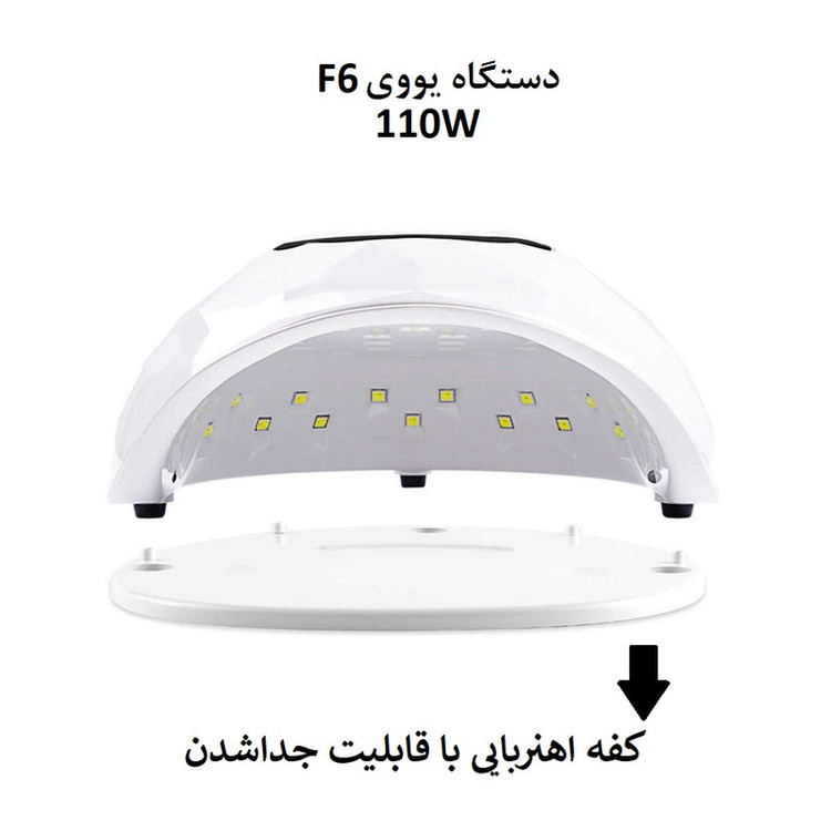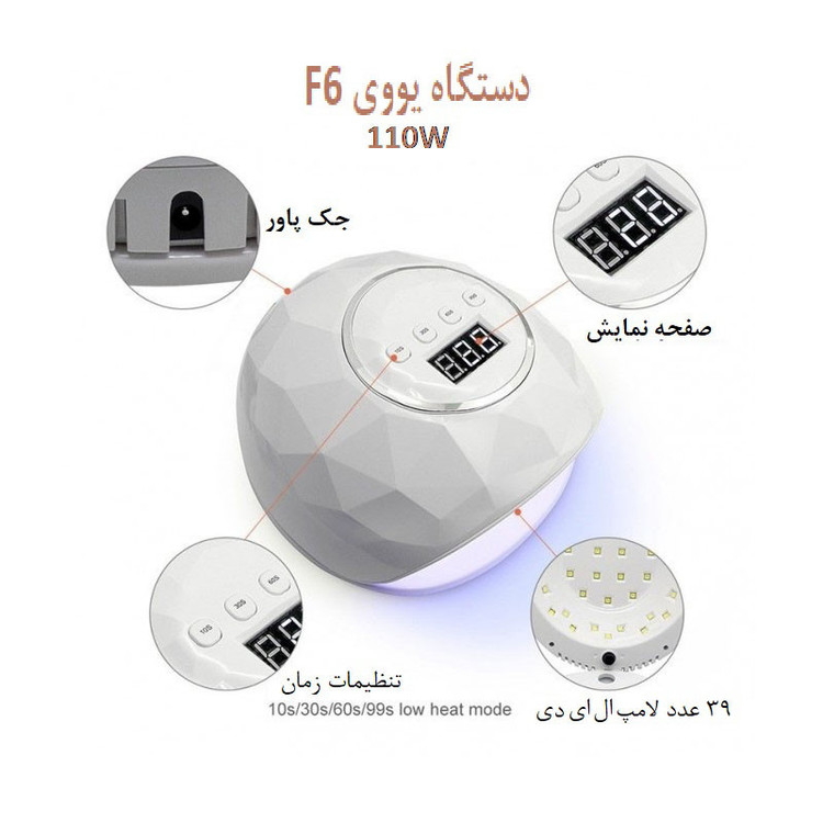 دستگاه UV – LED ناخن F6 یکی از جدیدترین و بهترین دستگاه های بازار می باشد، مزیتی که دستگاه UV – LED ناخن F6 دارای تایمر خودکار، سنسور خودکار و صفحه نمایش دیجیتال بوده و قادر است با تولید قدرتی معادل 110 وات توسط 39 عدد لامپ ترکیبی یو وی ال ای دی هر نوع ژلی را در زمانی حدود 30 ثانیه خشک نماید. چند وقتی است دستگاه های ال ای دی و دستگاه های یو وی ناخن جای خود را به محصولی ترکیبی به نام دستگاه های یو وی – ال ای دی داده اند. مزیت این دستگاه های جدید در طول عمر بیشتر لامپ، سرعت بالاتر خشک کردن ژل ها (بین 10 نا 60 ثانیه بسته به قدرت) و توانایی خشک کردن تمامی ژل ها می باشد. لاک خشک کن با مدل دستگاه یووی جهت طراحی بر روی دست و پا تولید شده و همچنين لامپ های UV ـledکه قدرت 110 وات بوده ساخته شده است. کاربرد این لامپ ها در این محصول بگونه ای است که زمانیکه ژلی که جهت کاشت بوده را روی سطح ناخن قرار میدهند پرتو های این لامپ این ژل را سفت ميکند . و همچنین دستگاه یووی ها میزان قدرت خشک کردن ان ها براساس وات بالای ان ها محاصبه می شود ک هرچه وات بالا تر باشد قدرت خشک کردن زودتر انجام میشود ک یکی از مذیت های این دستگاه بالا بودن میزان وات دستگاه است .این ابزار جزو لوازم اصلی در حرفه ی کاشت و طراحی ناخن میباشد و حتما باید استفاده شود زیرا ک لاک معمولی در کاشت ناخن مورد استفاده قرار نمی گیرد و لاکژل استفاده می شود.