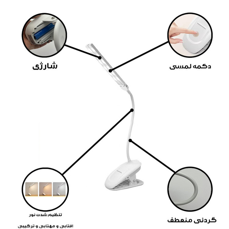 سایر توضیحات: نور افتابی مهتابی و ترکیبی ، دکمه لمسی ، باطری داخلی قابل شارژ ، تنظیم شدت نور ،توان 4 وات
