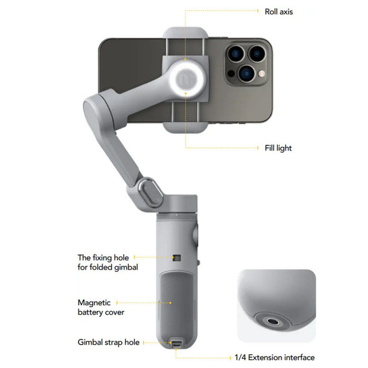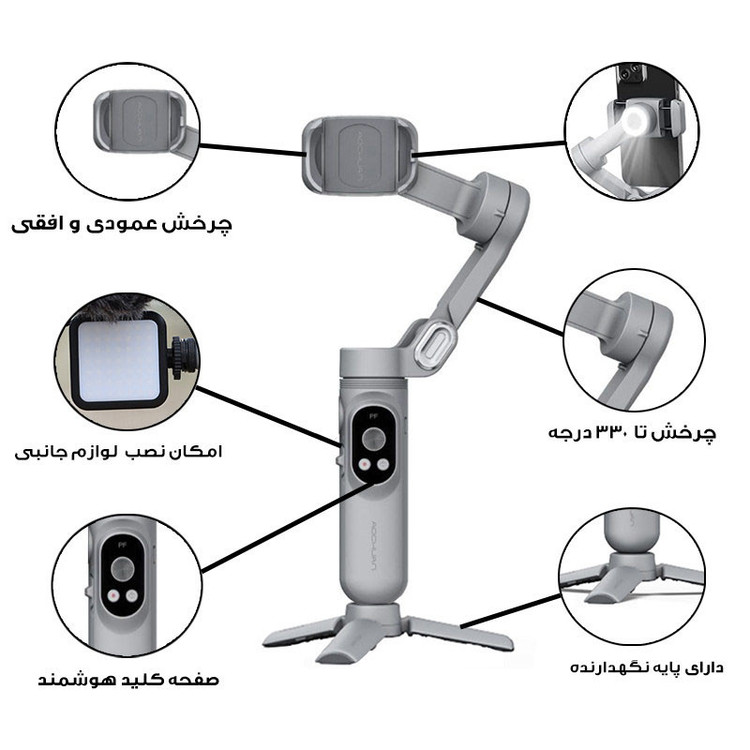 سایر توضیحات: مدل: SMART X محور چرخش تا 330 درجه مناسب برای گوشی های هوشمند (از 60 تا 86 میلی متر عرض) و تا 250 گرم اتصال: بلوتوث دارای سه پایه مناسب برای سطوح صاف باتری:باتری 2200 میلی آمپری با عمر طولانی