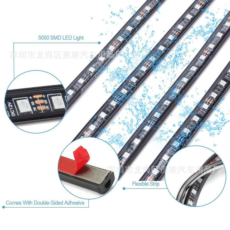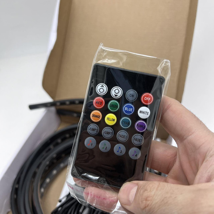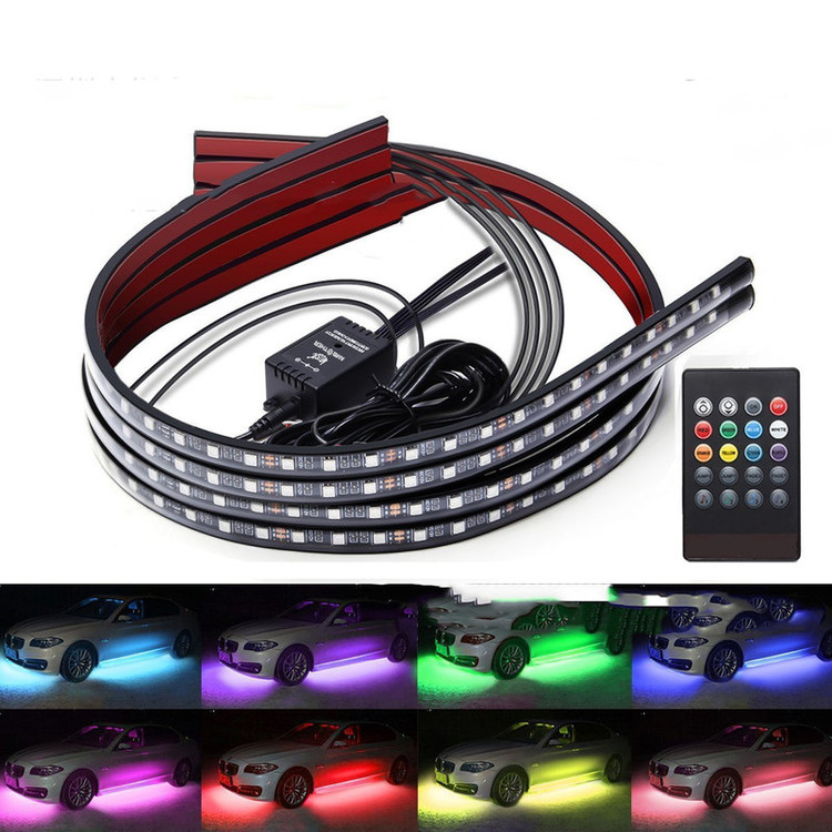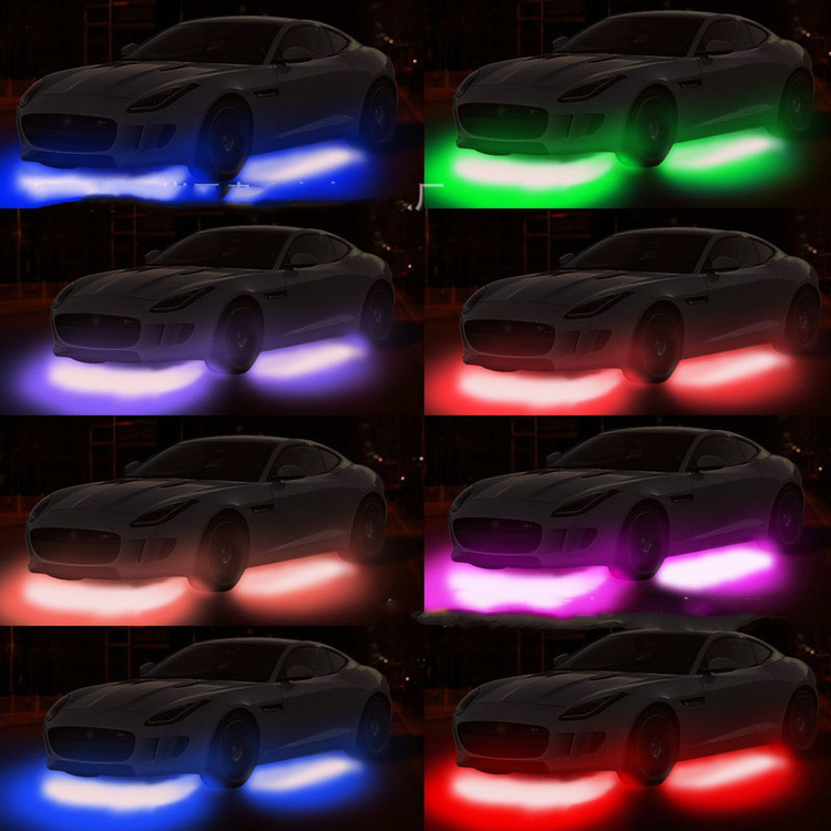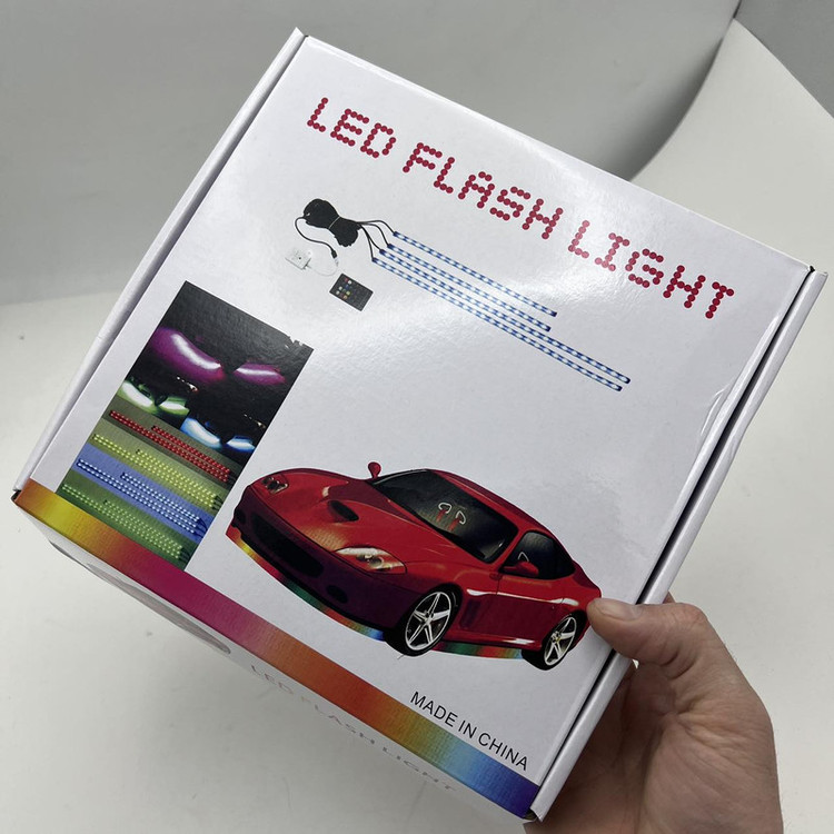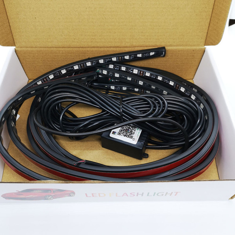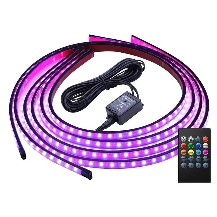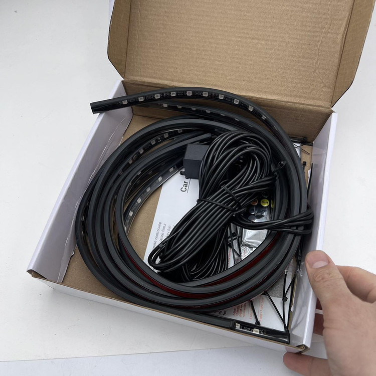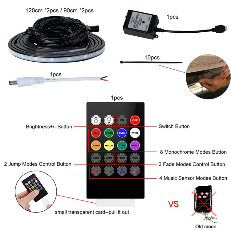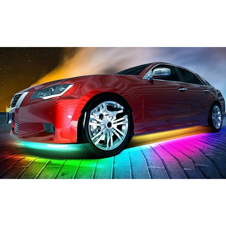 کیت نورپردازی زیر خودرو کنترلی مدل neon مناسب برای تمامی خودرو ها است.داخل بسته بندی این محصول 4عدد ال ای دی به طول 90 سانت و 120 سانتی متر وجود دارد که پشت هر ال ای دی چسب دو طرفه برای نصب در مکان دلخواه قرار داده شده است و میتواند ان ها را زیر خودرو در 4 جهت نصب کرده و زیر ماشین رقص نور زیبایی ایجاد میکند.این محصول دارای کابل مبدل میباشد که دو سر آن را میتوانید مستقیم به باطرب نصب کنید و همچنین دارای ریموت کنترل برای عوض کردن رنگ یا تغییر افکت نور پردازی میباشد و در انتها این محصول ضد آب بوده و امکان کم کردن نور یا تغییر رنگ RGB با استفاده از ریموت کنترل مقدور است .