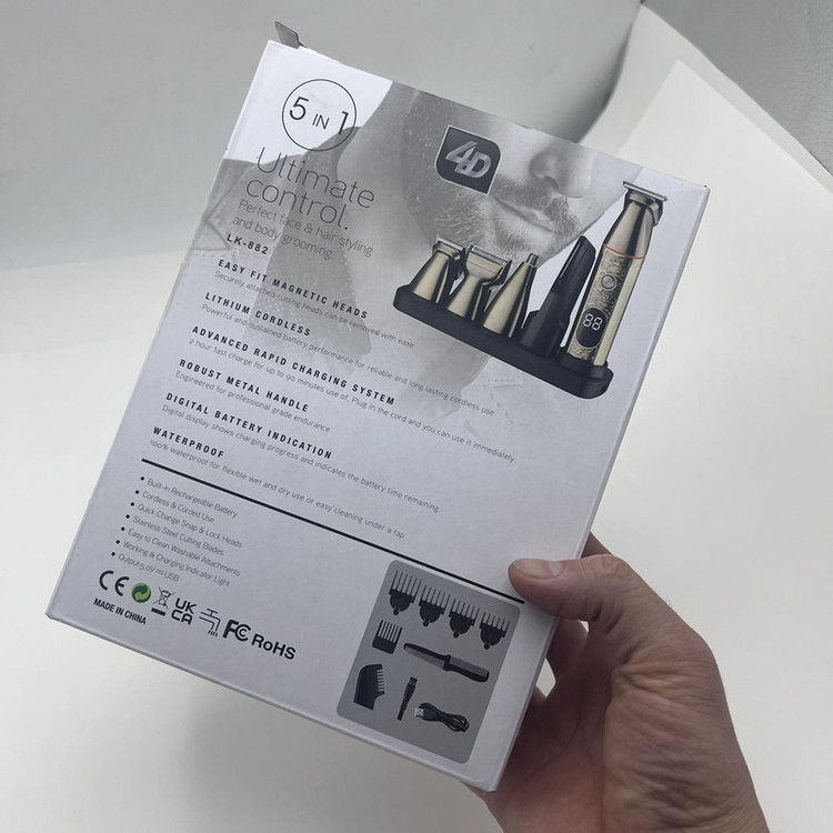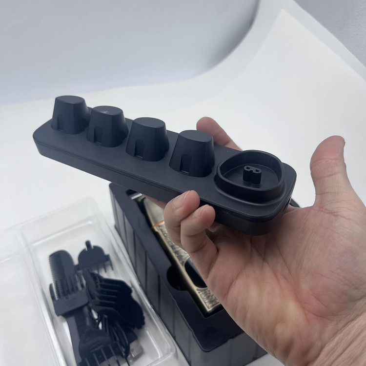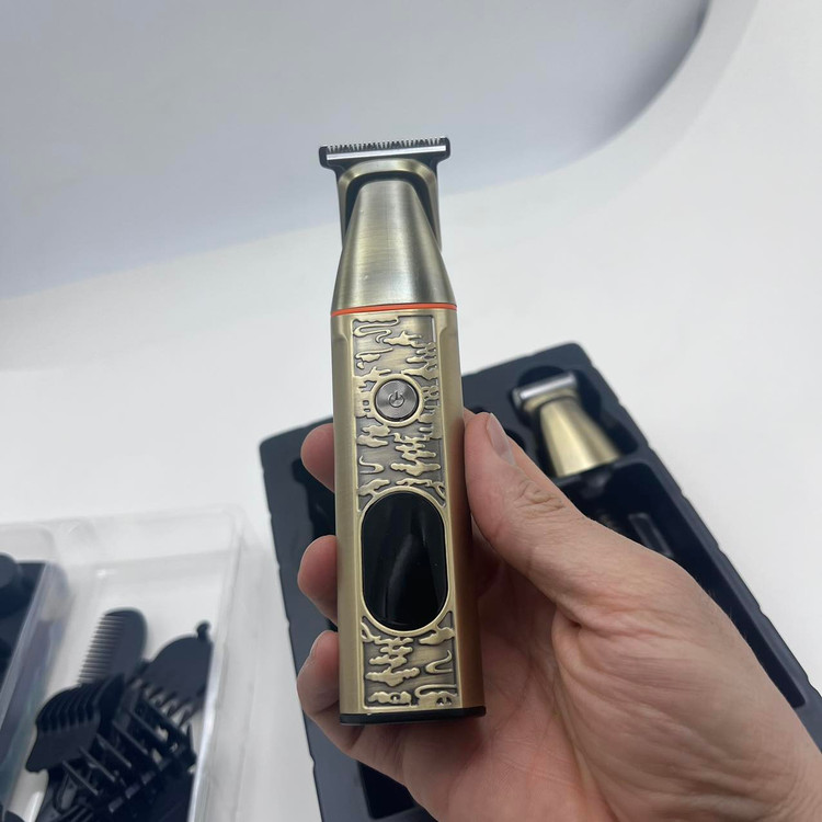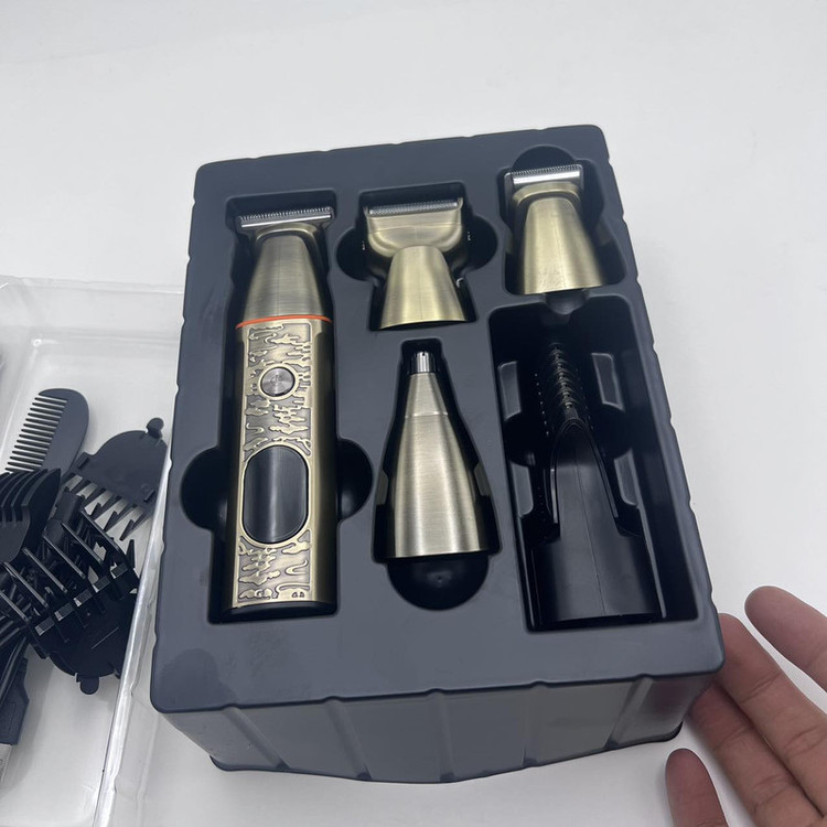اقلام همراه: دستگاه ماشین اصلاح با بدنه فلزی 6 عدد شانه کابل شارژ 5 عدد سری مخصوص کار های مختلف برس تمیز کننده شانه سر و استند شارژ