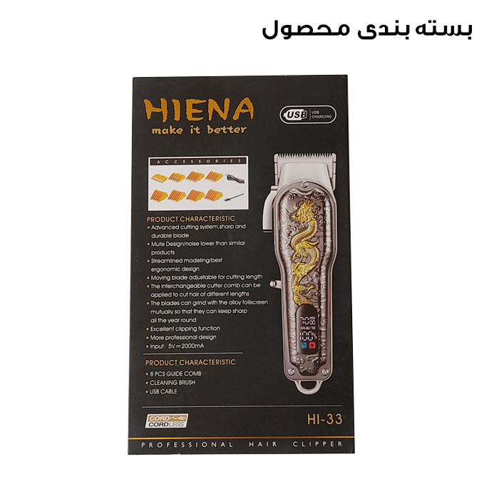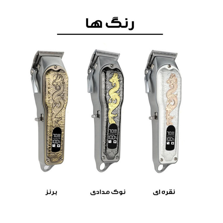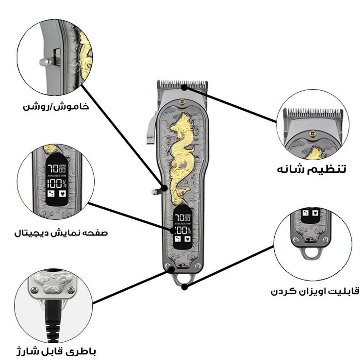دارای 8 سری سایز شانه ، دارای باطری قابل شارژ ، دارای صفحه نمایش دیجیتال