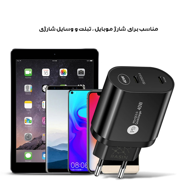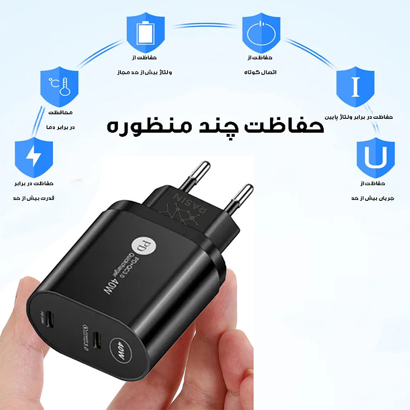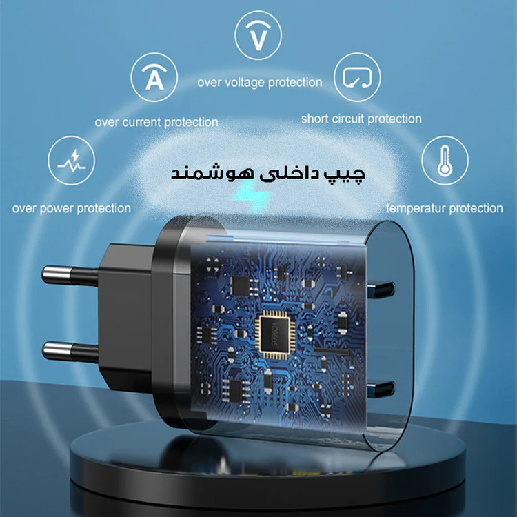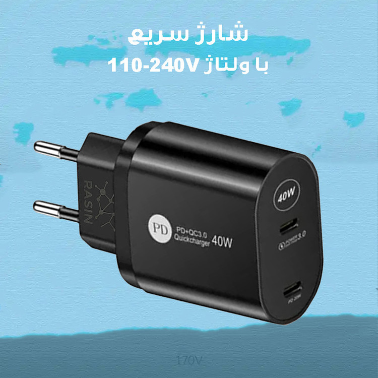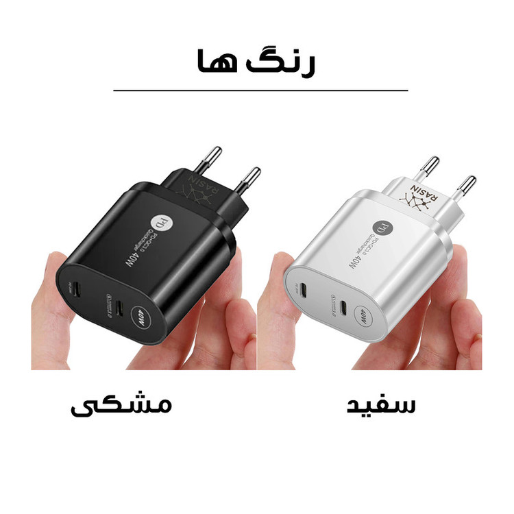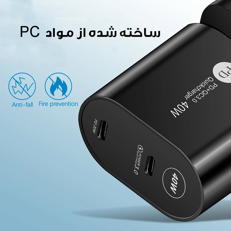 دو درگاه شارژ سریع TYPE-C به TYPE-C ، شدت جریان خروجی : 5V =4,0A و 9V=2.4A و 12V=1.8A شدت جریان داخلی AC100-240V 50/60HZ و 0.5A
