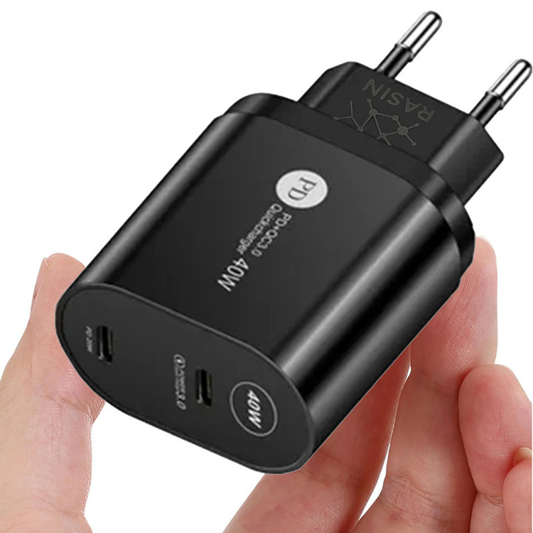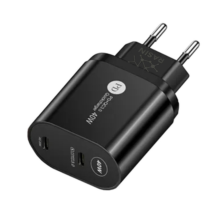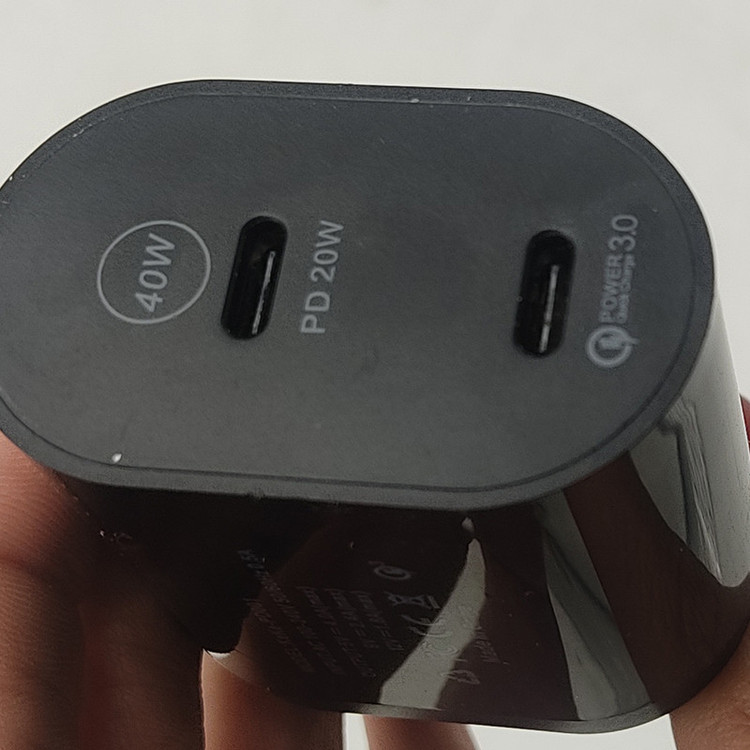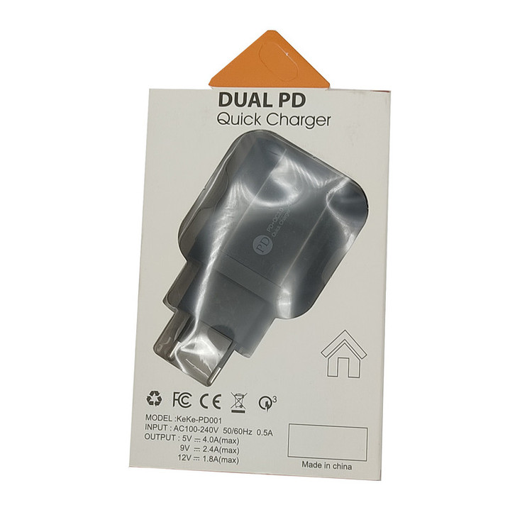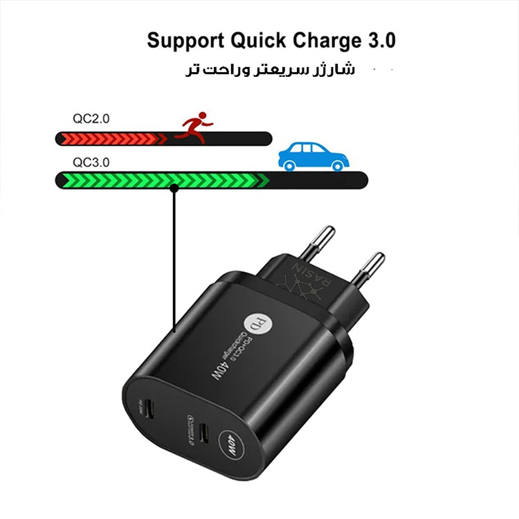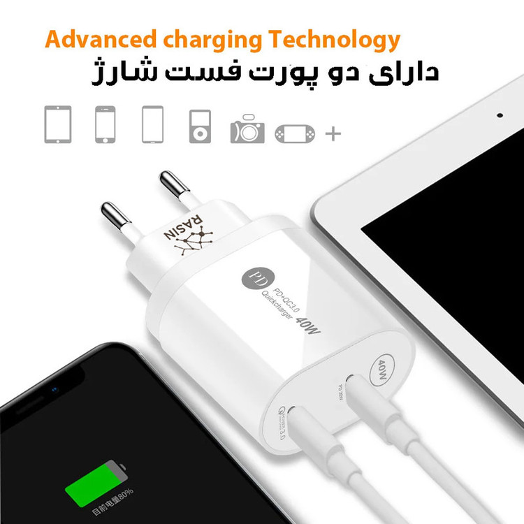 دو درگاه شارژ سریع TYPE-C به TYPE-C ، شدت جریان خروجی : 5V =4,0A و 9V=2.4A و 12V=1.8A شدت جریان داخلی AC100-240V 50/60HZ و 0.5A
