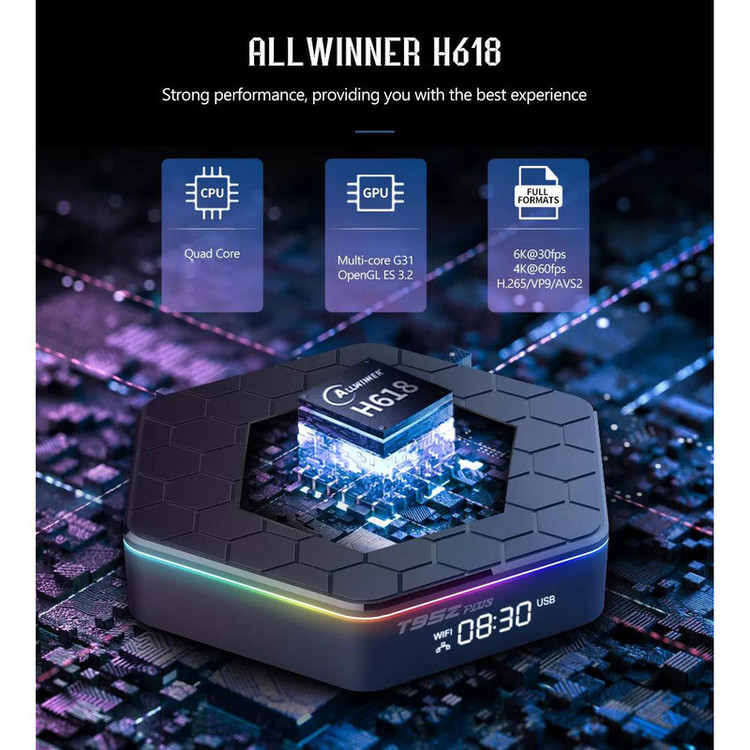 محصول T95Z PLUS یک اندروید باکس با سختافزار بالا هست که به شما امکان اجرا کردن برنامهها و بازیها در تلویزیون را میدهد. این محصول ششضلعی شکل است و دارای یک ساعت دیجیتال در پنل جلویی است. همچنین دارای یک نوار نوری در دور قسمت بالای کالا است که رنگ سبز و آبی را به خود میگیرد. این محصول شگفتانگیز دارای پردازنده 8 هستهای Amlogic S912 است و حافظه RAM(random access memory) که برای آن تعبیهشده است 4 گیگابایت ظرفیت و 32 حافظه دارد و دارا بودن سیستمعامل اندروید 12 نیز از نشانههای مدرن بودن این محصول است، همچنین شاید باور این موضوع سخت باشد که این دستگاه حتی از دو باند وای فای 2.4 و 5 گیگاهرتز بهطور همزمان بهره میبرد. از دیگر امکانات این دستگاه میتوان بلوتوث نسخه 4 را نام برد و ناگفته نماند که دارای 2 پورت USB نیز است.