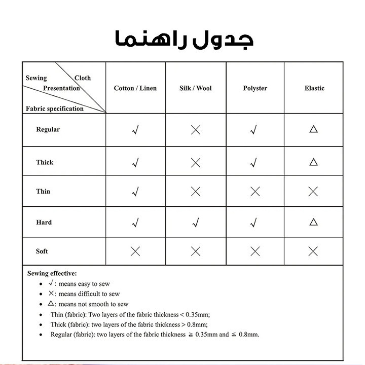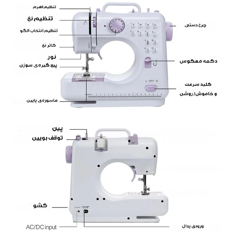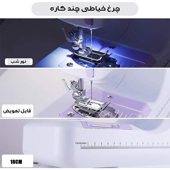 - دارای 12 مدل دوخت - دارای دکمه برگردان - دارای دکمه چپ و راست - دارای سرعت دوخت تا 9 - دارای خط کش روی بدنه تا 18 سانتی متر - دارای پدال - قابلیت کار کردن با باتری - دارای دکمه ضخامت دوخت - دارای لامپ