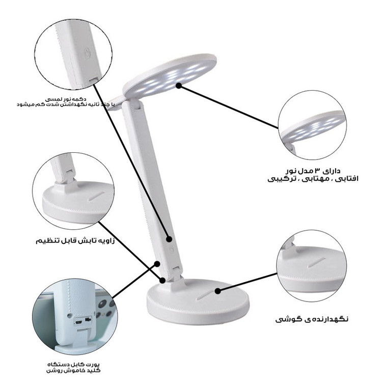 چراغ مطالعه مناسب برای استفاده اداری و دانش اموزان ،، دارای کلید ON/OFF ، دارای دکمه لمسی برای تعیین شدت نور و تغیر ، قابلیت هولدر گوشی و روشن شدن از طریق کابل USB