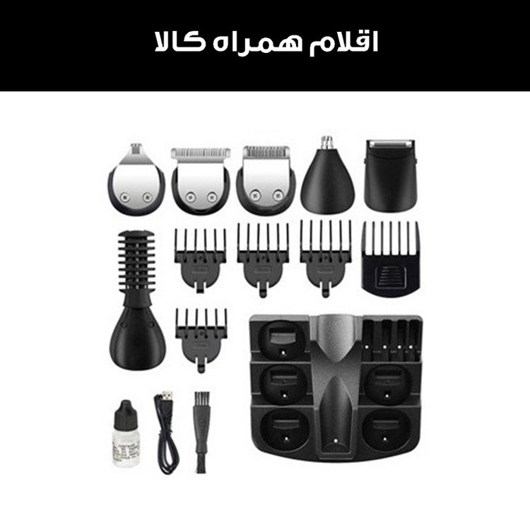 اقلام همراه: سری مو زن گوش و بینی سری صفر زن ، سری مو زن بدن ،شانه سایز بندی کابل شارژ دستگاه ماشین اصلاح