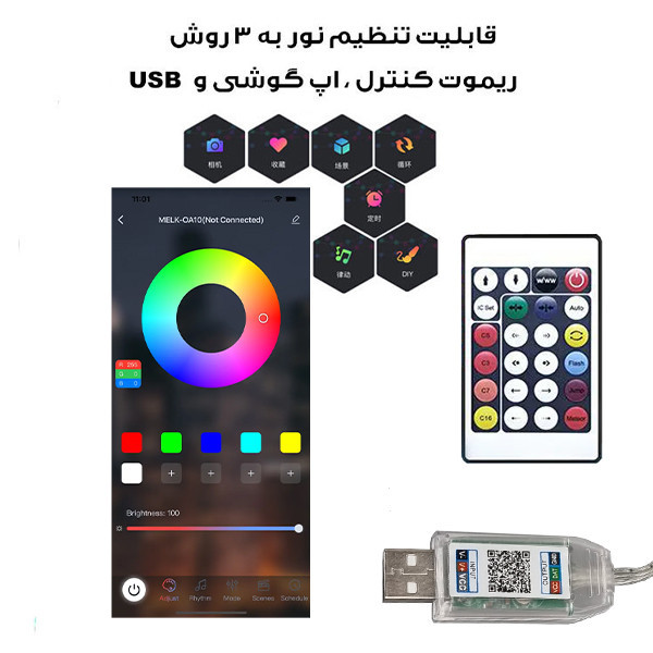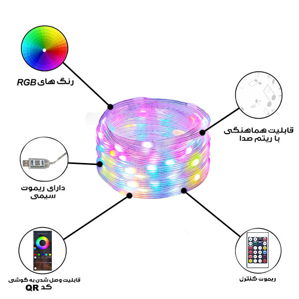 دارای ریموت کنترل ، دارای اپ فابلیت تنظیم نوع رنگ نور و تنظیم رقص نور در حالت های مختلف