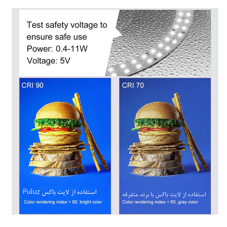 سایر توضیحات: ابعاد 40 در 40 سانتی متر / اقلام همراه : یک عدد لایت باکس Puluz ، یک عدد پارچه دیفیوزر ، کابل USB ، شش عدد بکگراند دوطرفه ، یک عدد کیف حمل / CRI : >90 / ولتاژ 5V / مصرف برق 0.4-11W /