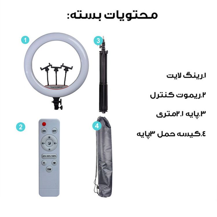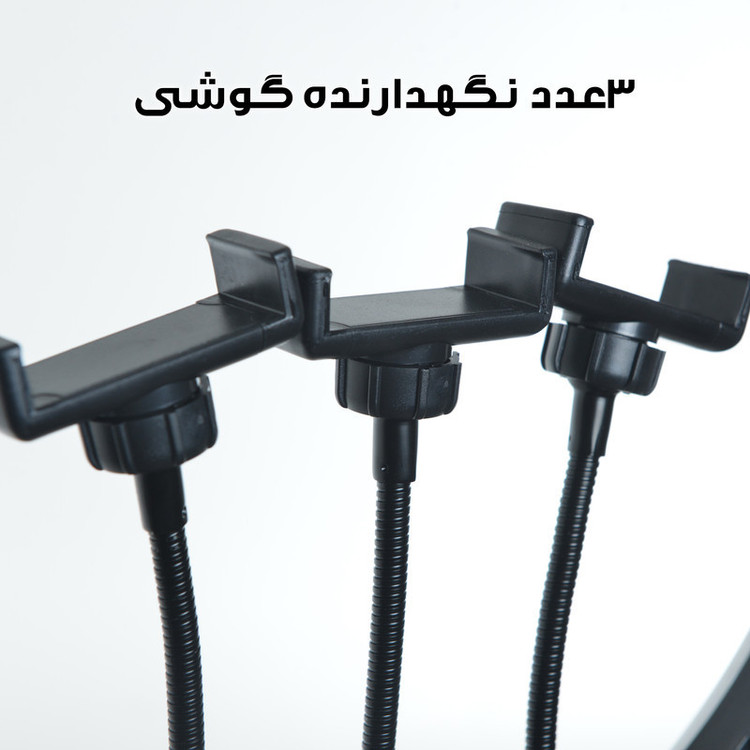 3عدد هولدر نگهدارنده موبایل - 3پایه 210 سانتی متری به همراه کیف حمل 3پایه_ قطر خارجی رینگ لایت 45 سانتی متر - دمای رنگ قابل تنظیم بصورت آفتابی ، مهتابی و ترکیبی - دارای کنترل از راه دور برای کنترل رینگ لایت- - راه اندازی با برق مستقیم شهری