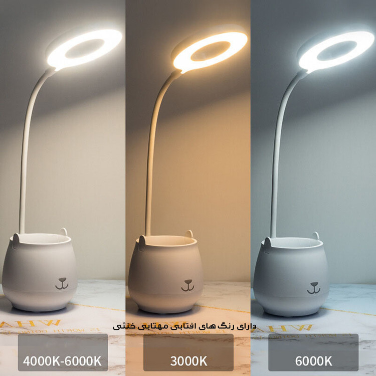 دارای باطری داخلی قابل شارژ ، دارای جا مدادی ، قابلیت نگهداشتن گوشی ، دارای سه رنگ افتابی مهتابی ترکیبی ، دارای دکمه لمسی