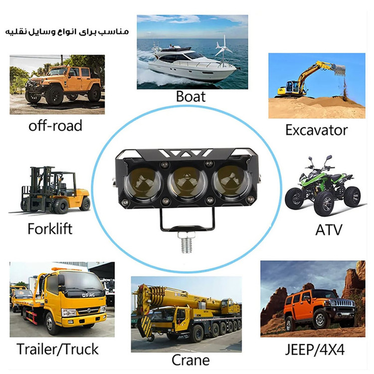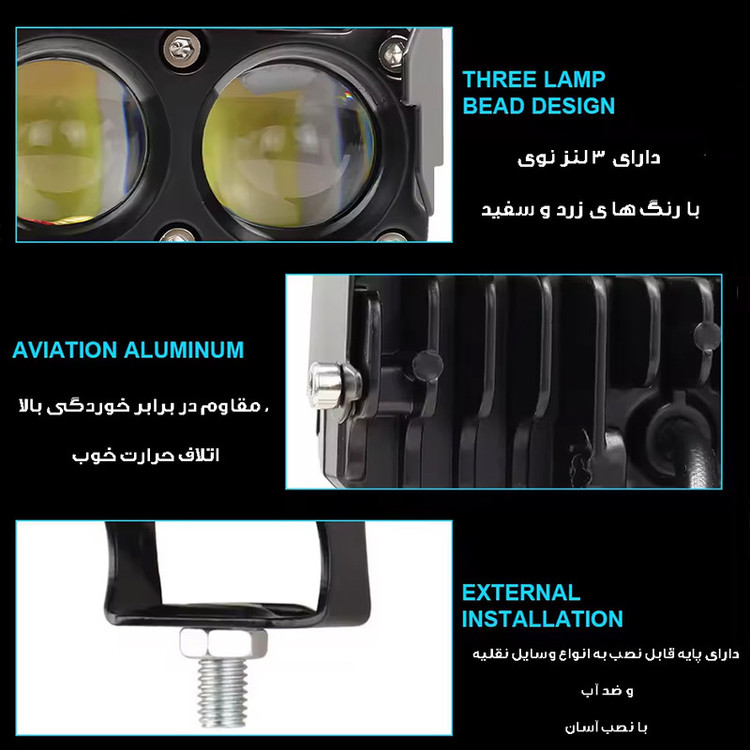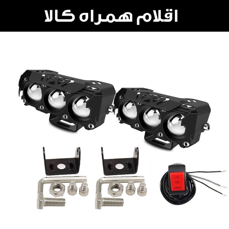 سایر توضیحات: دارای نور زرد و سفید / دارای کلید قطع و وصل کن / پروژکتور آفرودی ۳ لنز / مناسب برای خودرو های آفرودی جیپ پاترول پاژن لندرور جک t8 فوتون وانت پیکاپ و موتور های ادونجری قابل نصب بر روی سپر و باربند