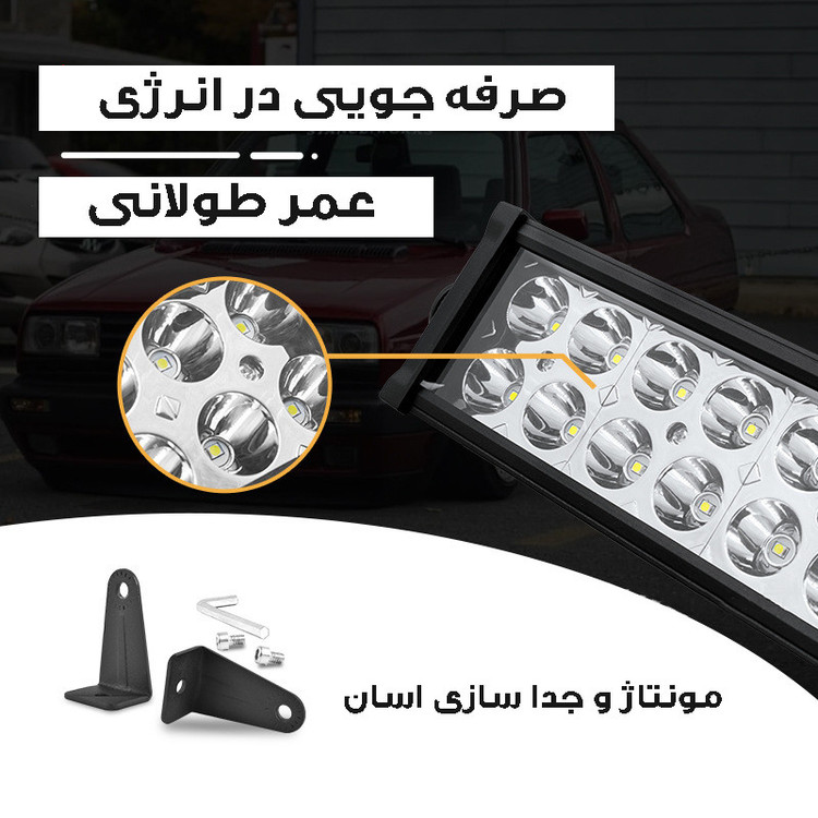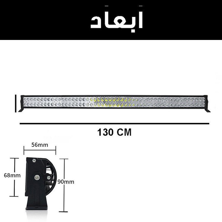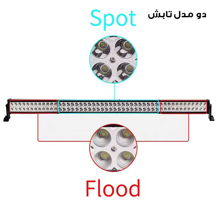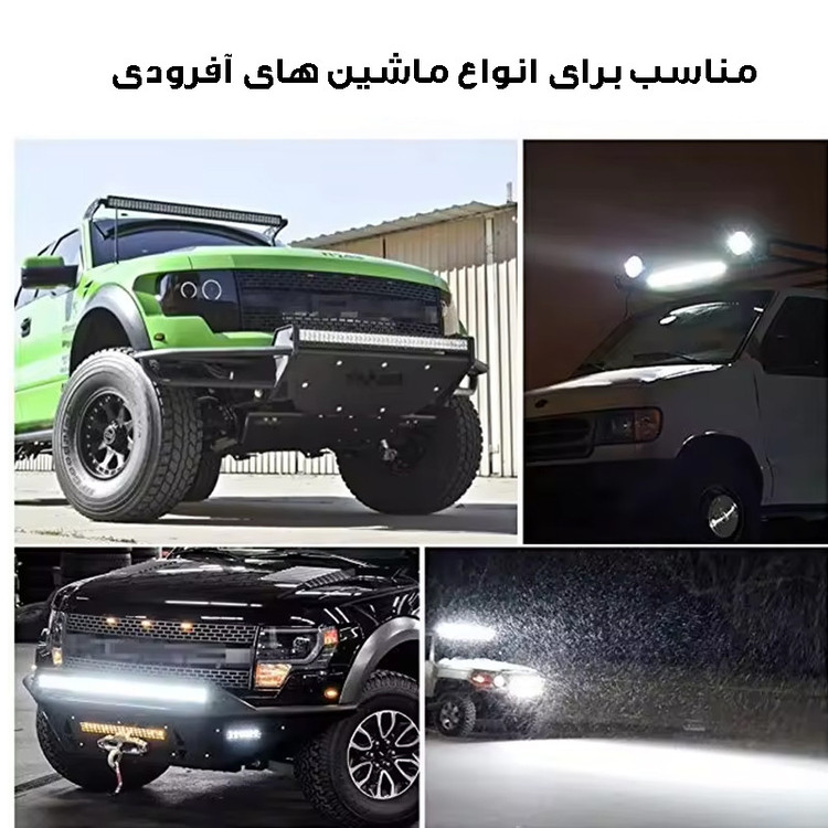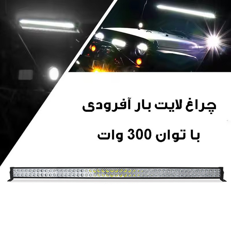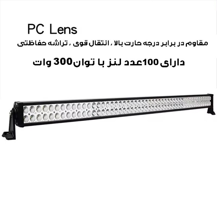 سایر توضیحات: همراه این لایت بار ، پیچ و مهره و پایه اتصال قرار دارد پرژکتور لایت بار ،قابلیت نصب بر روی سقف یا جلو گارد خودرو را داشته و همچنین نور آن سفید یخی ثابت می باشد.بر روی این لایت بار 100 LED قرار گرفته و همچنین توان آن 300 وات است .