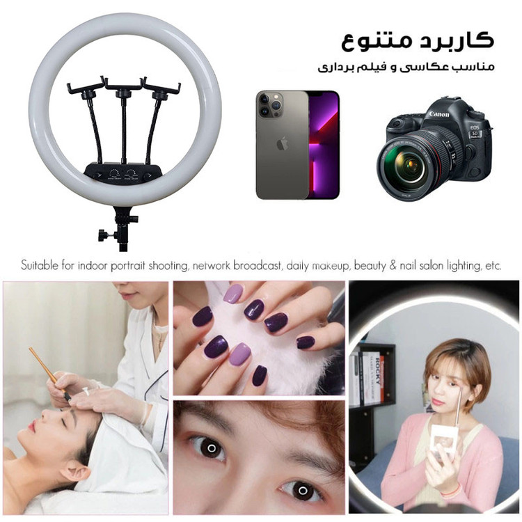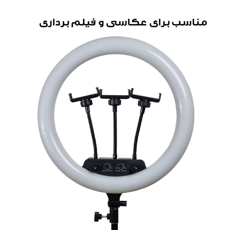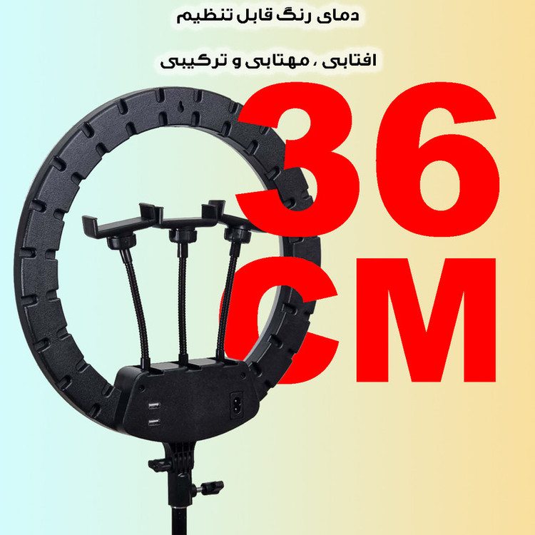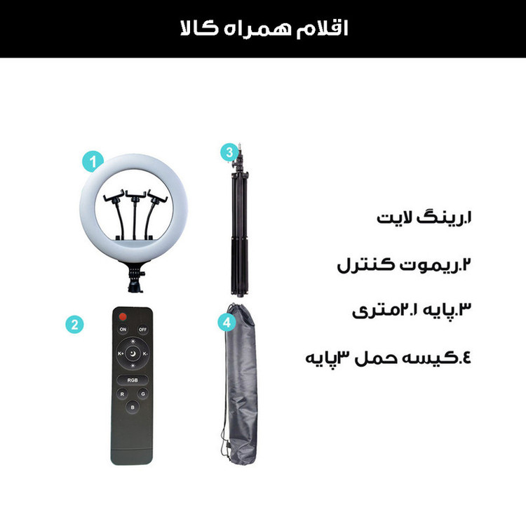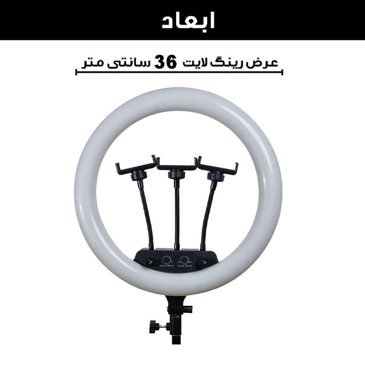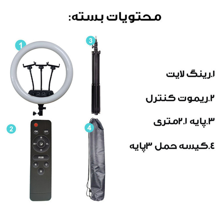 ویژگی ها: 3عدد هولدر نگهدارنده موبایل - 3پایه 210 سانتی متری به همراه کیف حمل 3پایه_ قطر خارجی رینگ لایت 36 سانتی متر - دمای رنگ قابل تنظیم بصورت آفتابی ، مهتابی و ترکیبی - دارای کنترل از راه دور برای کنترل رینگ لایت- - راه اندازی با برق مستقیم شهری