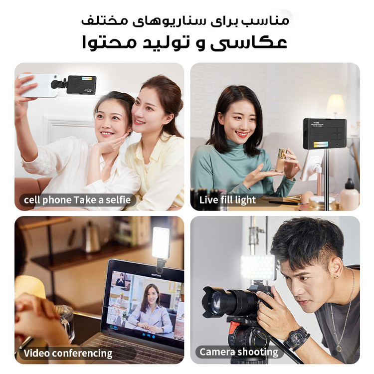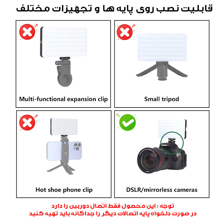 دارای 3 نور تابشی ( افتابی مهتابی خنثی ) ، قابل استفاده بصورت عمودی و افقی ، مناسب برای دوربین ،