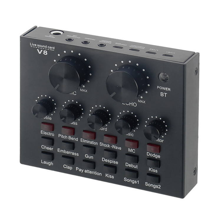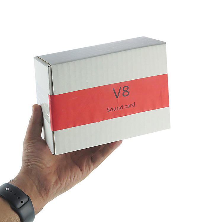 این لاین سفارش کارت صدای v8 در یک جعبه سفید رنگ قرار دارد که بر روی آن نوار قرمز رنگی قرار دارد که بر روی آن عبارت V8 sound card نوشته شده است و کل جعبه در وکیوم سلفنی می باشد که تصویر آن را می توانید مشاهده بفرمایید . در درون این جعبه کارت صدای V8 به صورت وکیوم در پلاستیک ضد ضربه قرار دارد و همچنین همراه آن سه عدد کابل مخصوص به صورت وکیوم هست و همچنین یک عدد کاتالوگ و یک برگه که بر روی آن QR Code قرار دارد و با اسکن کردن آن می توانید فیلم آموزشی کارت صدای V8 را مشاهده بفرمایید . پورت های پشت این لاین سفارش از کارت صدای V8 از سمت راست به این صورت است : اولین و دومین پورت Dynamic mic و بعد Condenser mic که شما برحسب نوع میکروفون خود به یکی از این دو پورت می توانید میکروفون خود را متصل کنید . سومین و چهارمین پورت Headset و Earphone Speaker هستند که برای مانیتورینگ و یا اتصال به اسپیکر و شنیدن حاصل کار استفاده می شود . پنجمین پورت charging هست که برای شارژ دستگاه از آن استفاده می شود . ششمین پورت Accompany Instrument هست که برای اضافه کردن موزیک به کارت صدا استفاده می شود که البته شما با بلوتوث نیز می توانید این کار را انجام دهید . هفتمین و هشتمین نیز Live1 , Live2 هست که می توانید خروجی کار خود را به دو دستگاه همزمان بفرستید و آن را رکورد کنید و یا هر کار دیگری که مد نظرتون هست را انجام بدهید . روی دستگاه نیز دکمه هایی قرار دارد که برای کنترل صدا و افکت گذاری استفاده می شود .