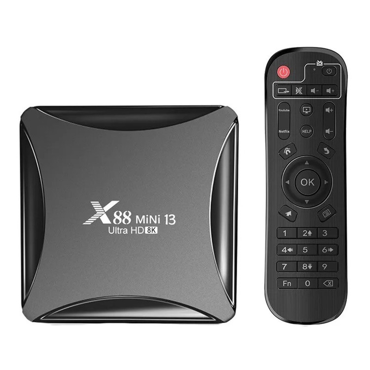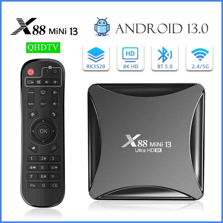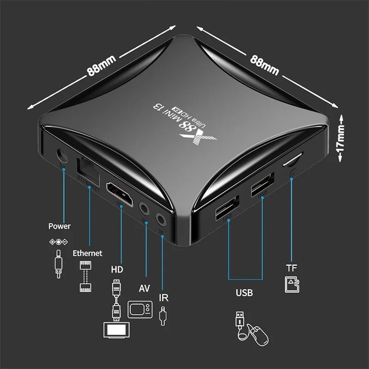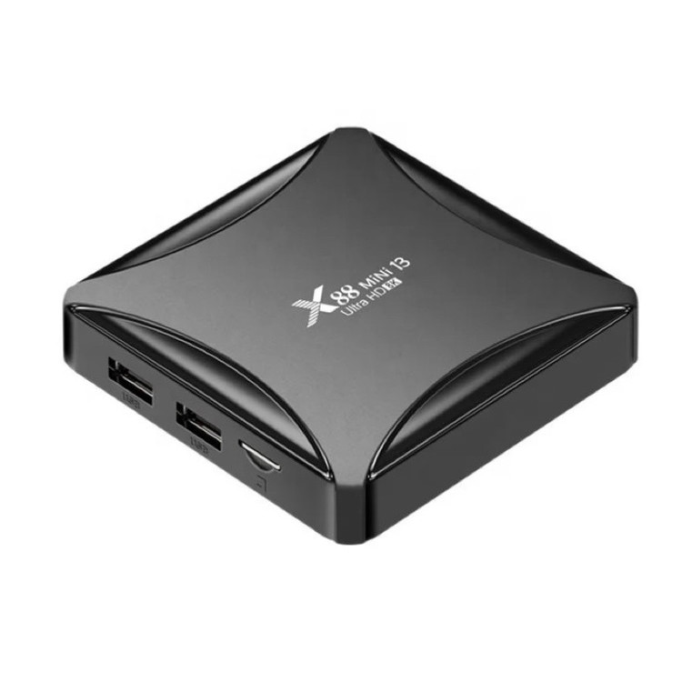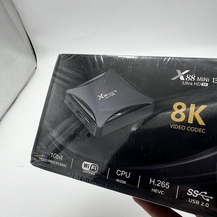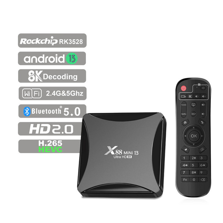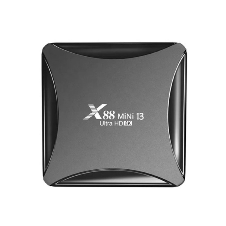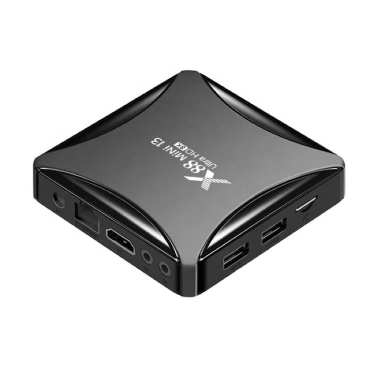 اندروید باکس x88 mini 13 Ultra HD 8k از سری اندروید باکس های X88 با طراحی زیبا و اندروید جدید ورژن 13 می باشد.اگر دنبال تبدیل تلویزیون خود به تلویزیون هوشمند هستید و میخواهید نرم افزار های پر طرفدار اندروید را روی تلویزیون خود داشته باشید، فیلم ببینید از پلتفرم های فیلیمو ، نماوا ، فیلم نت و..... وب گردی کنید، بازی های اندروید قابل استفاده در اندروید باکس را نصب کنید و ساعات مفرح برای خود و خانواده خود ایجاد کنید راه حل آن خرید اندروید باکس است.این اندروید باکس دارای RK3528 Quad-Core 64bit Cortex-A53 و گرافیک Mali 450 MP2 می باشد با حافظه داخلی 64 گیگ و رم 4 گیگ که دستگاهی باکیفیت و سرعت بالا را به ارمغان آورده است.این اندروید باکس دارای بلوتوث ورژن 5 است.درارای دو پورت ورودی USB2 همچنین دارای 2.4G /5G dual-band Wifi 802.11 a/b/g/n و کیفیت تصویر تا 8K می باشد.این دستگاه دارای ورودی کابل LAN و همچنین ورودی SD Card نیز می باشد و از طریق پورت HDMI و کابل HDMI تصویر را به تلویزیون شما انتقال می دهد.