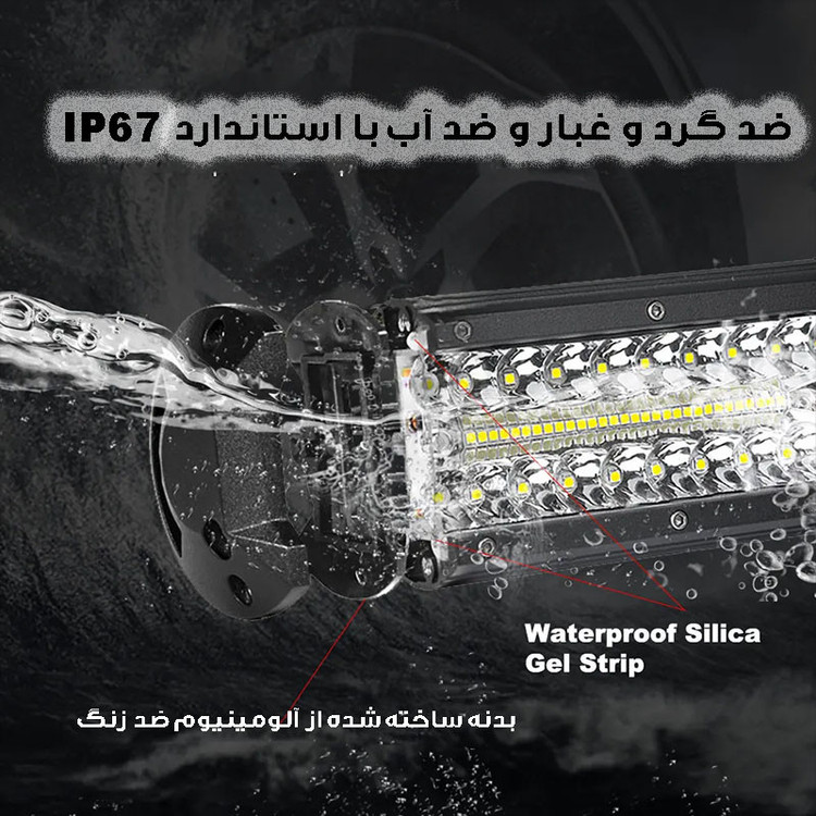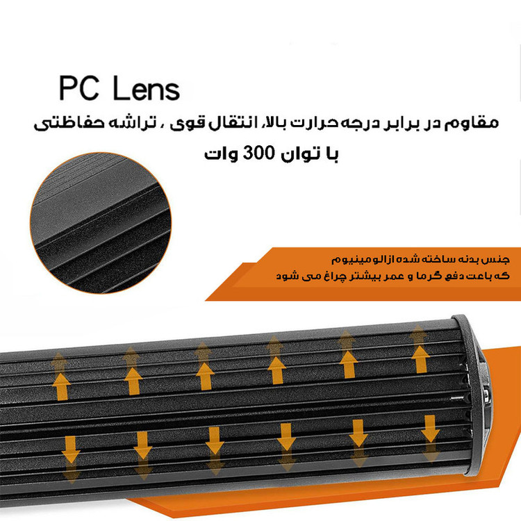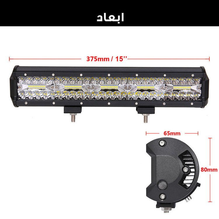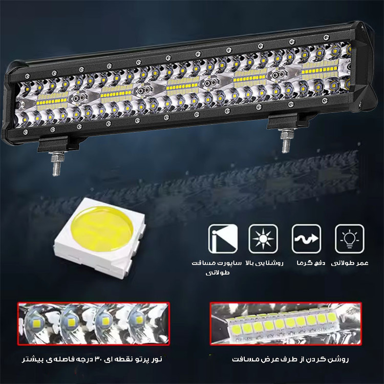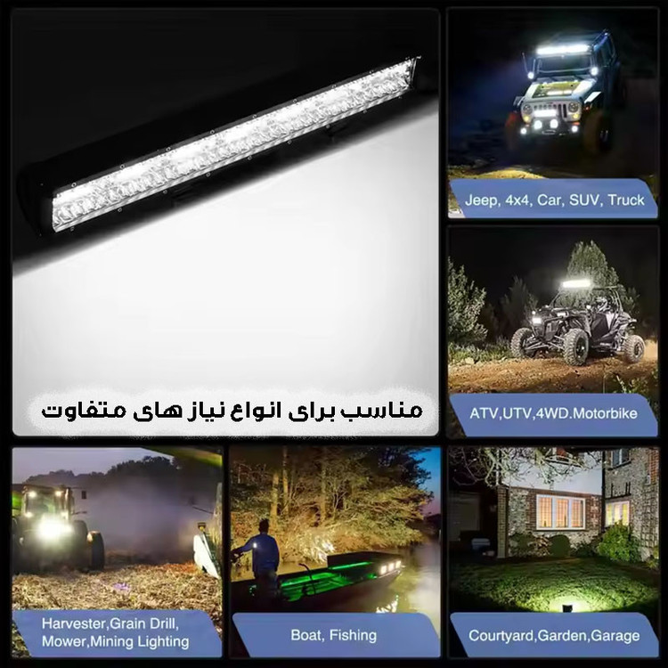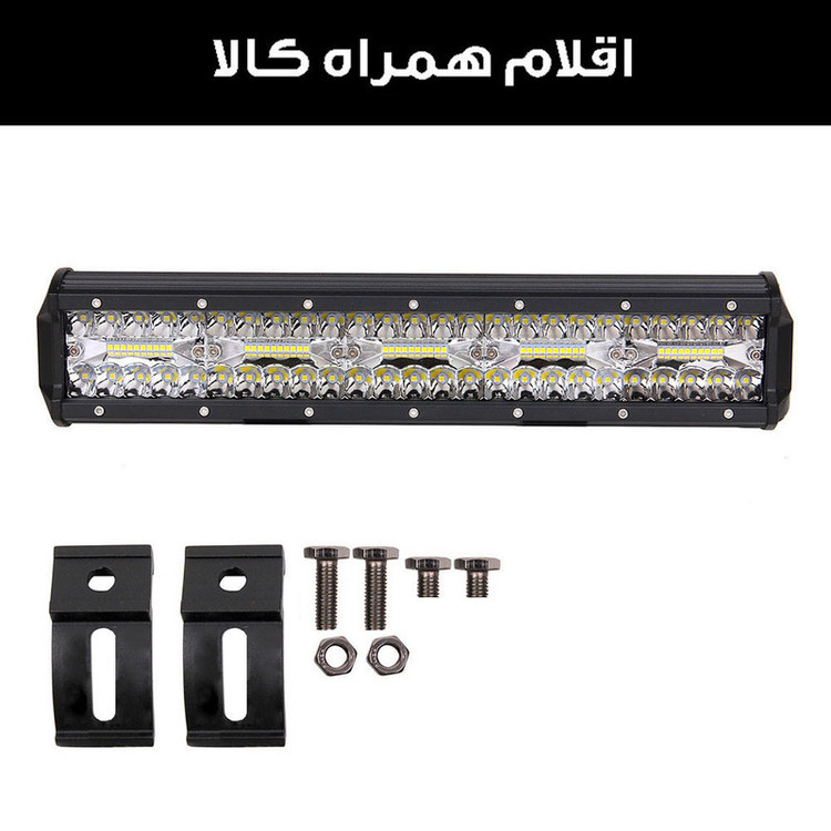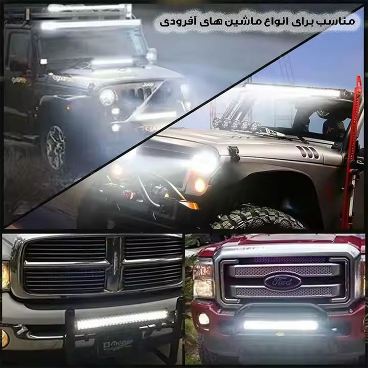 سایر توضیحات: همراه این لایت بار ، پیچ و مهره و پایه اتصال قرار دارد پروژکتور لایت بار ،قابلیت نصب بر روی سقف یا جلو گارد خودرو را داشته و همچنین نور آن سفید یخی ثابت می باشد همچنین توان ان 300 وات است .