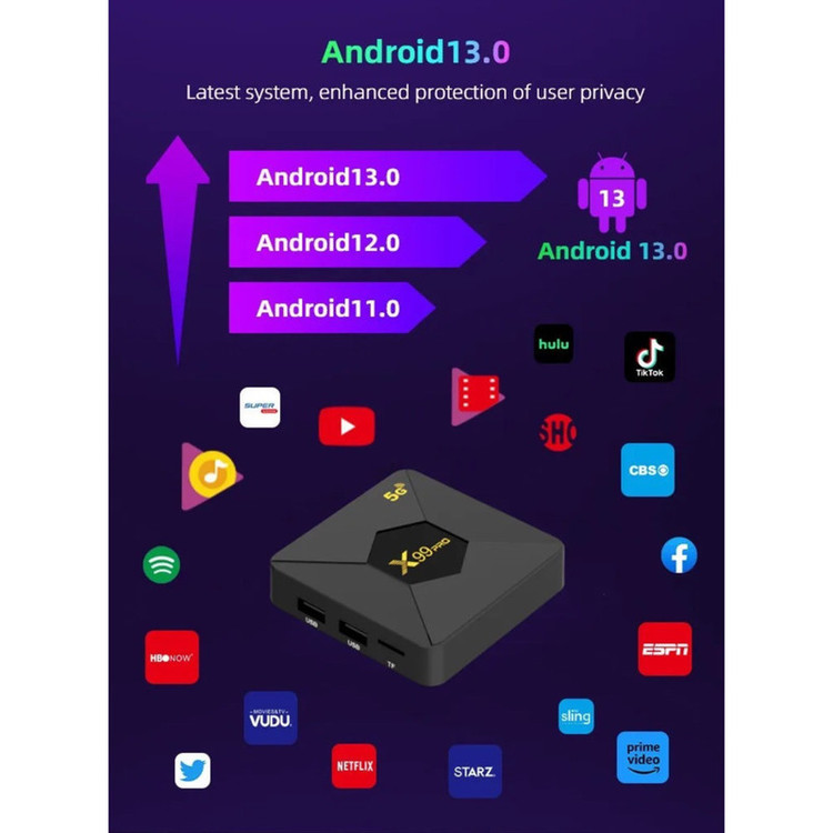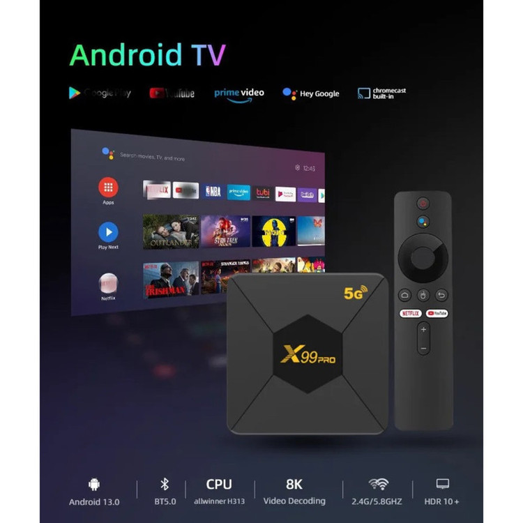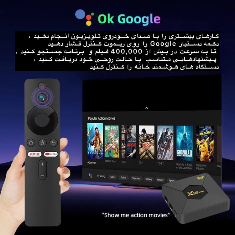 اندروید باکس مدل X99 Pro 5G، یک دستگاه هوشمند چندمنظوره با قابلیتهای پیشرفته برای ارتقاء تجربه تماشای تلویزیون است. این دستگاه از پردازنده چهار هستهای ARM Cortex و پردازنده گرافیکی Mali-G31 بهره میبرد که قدرت پردازشی و گرافیکی قابل قبولی برای پخش روان محتواهای 4K Ultra HD و اجرای برنامههای مختلف ارائه میدهد. با 2 گیگابایت رم DDR3 و 8 گیگابایت حافظه داخلی eMMC، این دستگاه امکان نصب و اجرای اپلیکیشنهای محبوب همچون Netflix، YouTube، Disney+ و سایر برنامههای اندرویدی را فراهم میکند. از دیگر ویژگیهای برجسته این دستگاه میتوان به پشتیبانی از وایفای دو بانده (2.4 و 5.8 گیگاهرتز) و بلوتوث نسخه 5.2 اشاره کرد. همچنین کنترل صوتی با بلوتوث و پشتیبانی از Google Assistant به کاربر اجازه میدهد تا به راحتی با صدای خود در بیش از 400,000 فیلم و برنامه جستجو کند، دستگاههای هوشمند خانه را مدیریت کند، و تجربهای مدرن و هوشمند از تماشای تلویزیون را تجربه کند. این دستگاه با طراحی کوچک و زیبا و کنترل ریموت پیشرفته با دکمههای اختصاصی برای Netflix و YouTube، مناسب استفاده در هر خانهای است. X99 Pro نه تنها به عنوان یک دستگاه پخش کننده تلویزیونی عمل میکند، بلکه یک مرکز هوشمند خانگی برای مدیریت سرگرمی و دستگاههای هوشمند محسوب میشود.