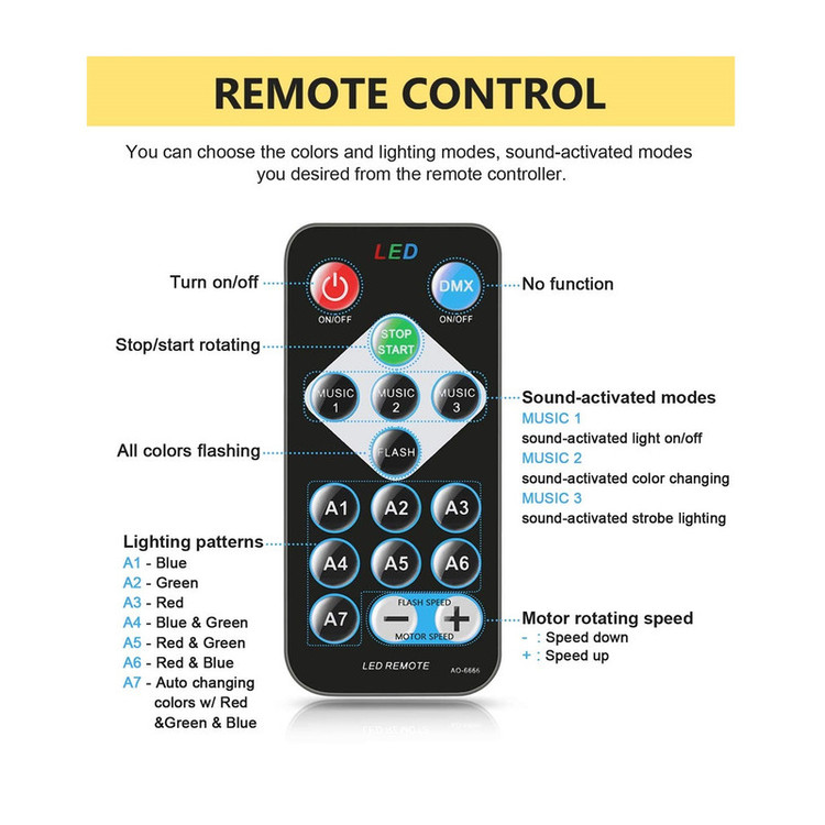 Colour Macros , Strobe 0 - 10 Hz , Sound Active , RGBW Colour Changing , Pan Fine , Pan , Manual Setup , Auto , Adjustable Sensitivity