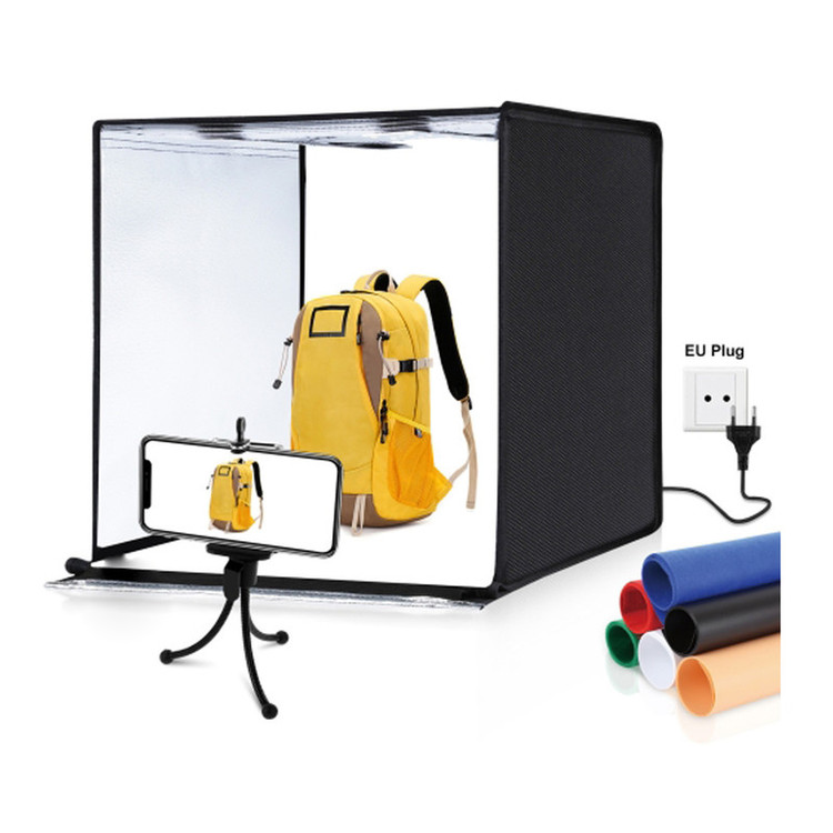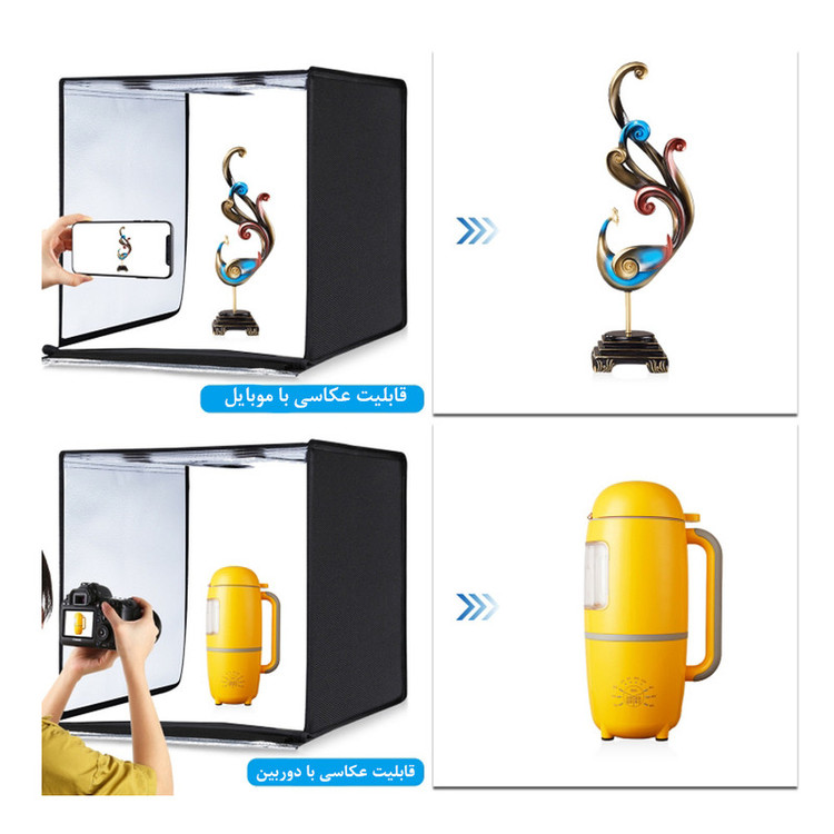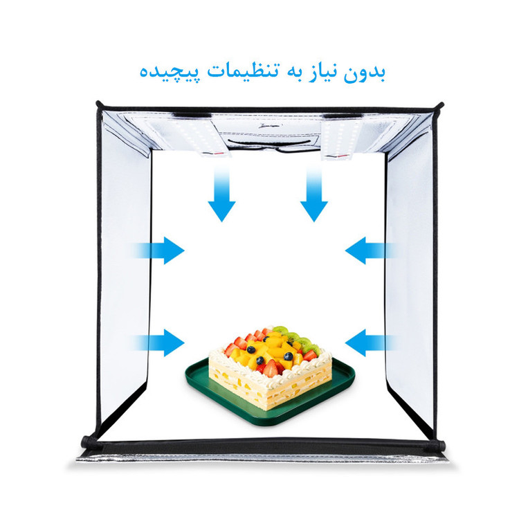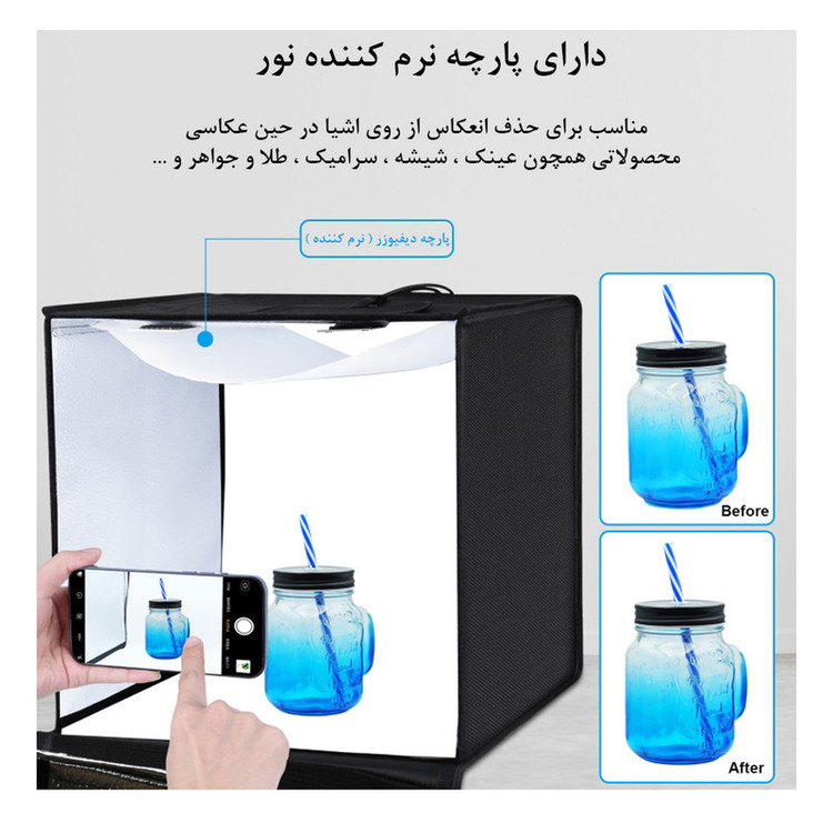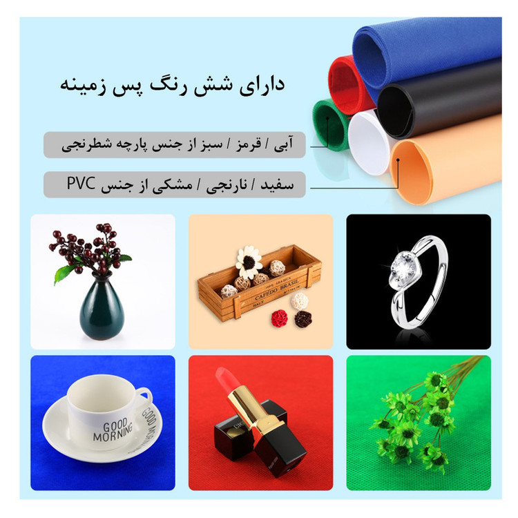 سایر توضیحات: دارای شش عدد بکگراند ( سه عدد PVC ، سه عدد پارچه شطرنجی ) / دارای سه پایه نگهدارنده موبایل / دارای آداپتور برق / دارای دو عدد LED .