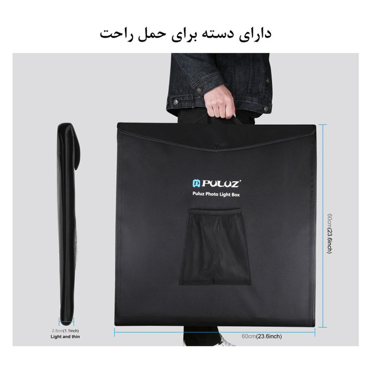 ویژگی ها: کلوین 5500K / دارای دیمر تنظیم قدرت نور / دارای دو جهت برای عکاسی ( زاویه بالا ، زاویه روبرو ) / دارای پارچه نرم کننده نور