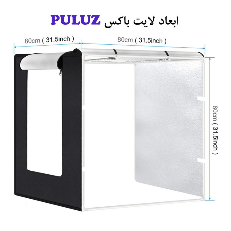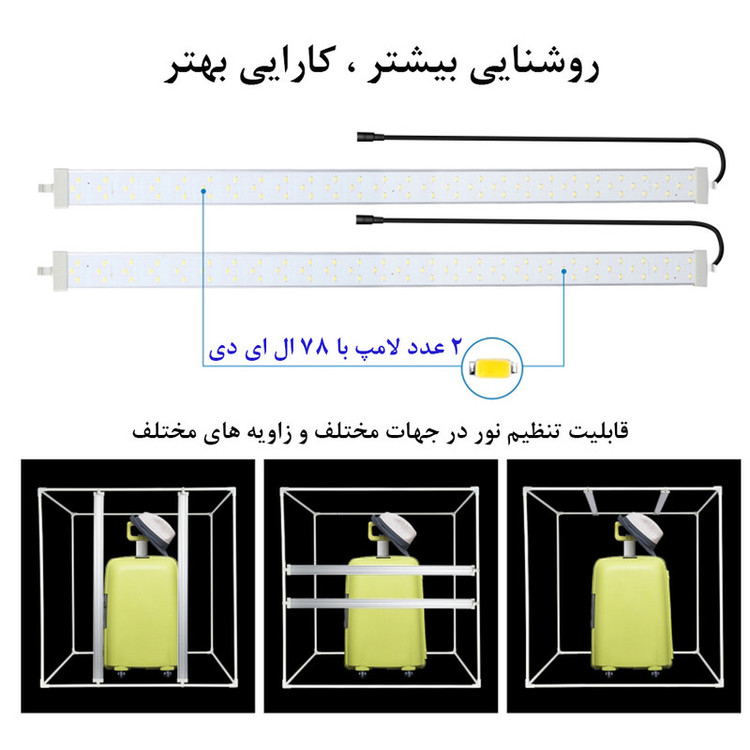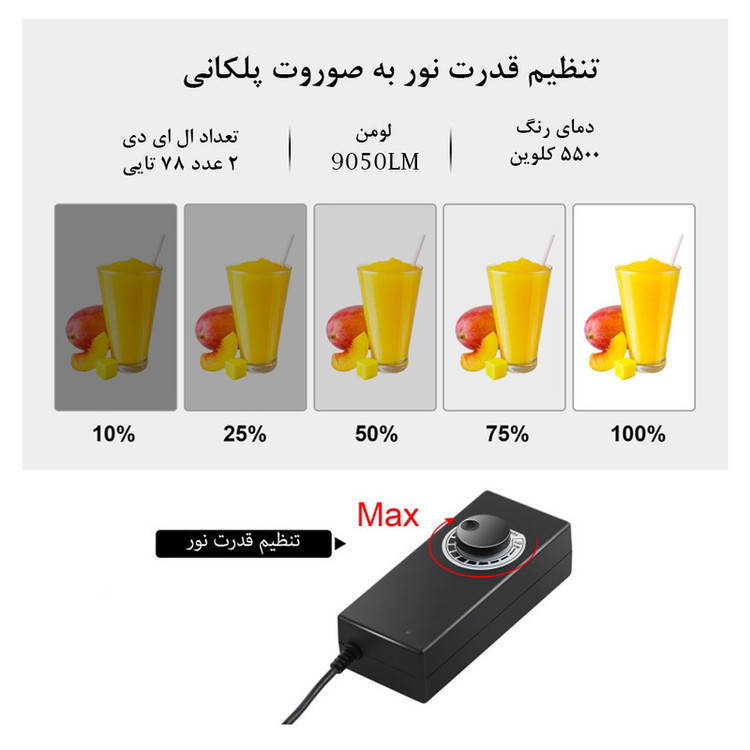 قدرت خروجی 80 وات / ابعاد 80 سانتی متر / رنگ سفید دمای رنگ 5500 کلوین / شار نور 9050 لومن / امکان عکاسی از زاویه بالا و روبرو / بدون پرش نور /