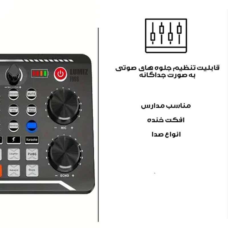 کارت صدای مدل F998 از برند لومیز یک کارت صدای حرفه ای است که میتوانید افکت های ضبط صدا استفاده کنید و صدا را به صورت حرفه ای مانیتورینگ کنید. این کارت صدا یک کارت اکسترنال رو میزی است که برای ضبط زنده، پادکست و صدابرداری مناسب است. این کارت صدا با امکانات زیادی این امکان را به شما می دهد تا حین ضبط صدا تسلط کامل بر صدای خود داشته باشید و از افکت های ضبط صدا نیز استفاده کنید. به همین دلیل از این کارت می توانید برای کنفرانس ، آواز و استودیوهای ضبط استفاده کنید. این مدل با کم ترین نویز صدا را بدون تاخیر پردازش می کند و قابلیت تقویت صدا، صدا گذاری و افکت گذاری دارد به این صورت که به کمک این کارت صدا می توانید در چندین حالت به صدای خود افکت دهید و زیر و بم صدا،باس و اکو صدا را کنترل کنید. به لطف ورودی و خروجی های کارت صدای می توانید به صورت همزمان میکروفون با کابل خروجی TRS ، هدفون ، ایرفون و گوشی موبایل خود را به کارت صدا متصل کنید و صدا را به صورت حرفه ای مانیتورینگ کنید. علاوه بر این می توانید با اتصال گوشی به کارت صدا از Backing Track یا صدای پس زمینه بر روی صدای خود استفاده کنید و تسلط کامل بر تنظیمات آن داشته باشید، صدای پس زمینه را کم و زیاد کنید یا در حین پخش صدای اصلی آن را حذف کنید. از طرفی با اتصال گوشی به کارت صدا می توانید صدای خود را رکورد کرده و از طریق هدفون صدا را کنترل کنید.