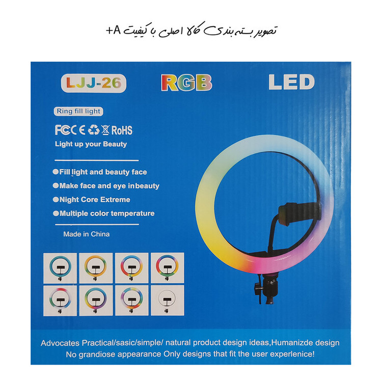 این رینگ لایت با قطر 26 سانتی متر و دارای رنگ های آفتابی ، مهتابی و همچنین با قابلیت تنظیم 7 رنگ RGB مناسب عکاسی پرتره و مدلینگ،ساخت ویدئو کلیپ های جذاب و حتی Light Painting یا نقاشی با نور است. از مهم ترین قابلیت های این رینگ لایت می توان به تنظیم رنگ نور در 3 حالت تک رنگ، رنگ ثابت و چرخش هفت رنگ RGB آن اشاره کرد.به این صورت که 7 رنگ RGB به صورت دوار بر روی رینگ لایت نمایش داده می شود. رینگ لایت هفت رنگ LJJ-26 از طریق پورت USB استفاده می گردد. این رینگ لایت قادر است با ایجاد روشنایی برابر با 1000 لومن تصاویر مناسبی در محیط های کم نور ایجاد کنند..تنظیمات این رینگ لایت از طریق کنترل روی کابل USB آن انجام می گردد.این کنترلر دارای دکمه ی روشن خاموش،دکمه ی Mode (تنظیم حالت انتخابی رنگ)،دکمه ی کم و زیاد کردن قدرت خروجی از 0 تا 100% است.دمای رنگ ها نیز در 3000 الی 6000 کلوین فعالیت می کنند و آزادی عمل کافی برای انتخاب طیف مناسب را به کاربران خواهند داد. همراه این رینگ لایت یک عدد هولدر موبایل قابل انعطاف و یک عدد سه پایه به ارتفاع دو متر ارائه می گرد