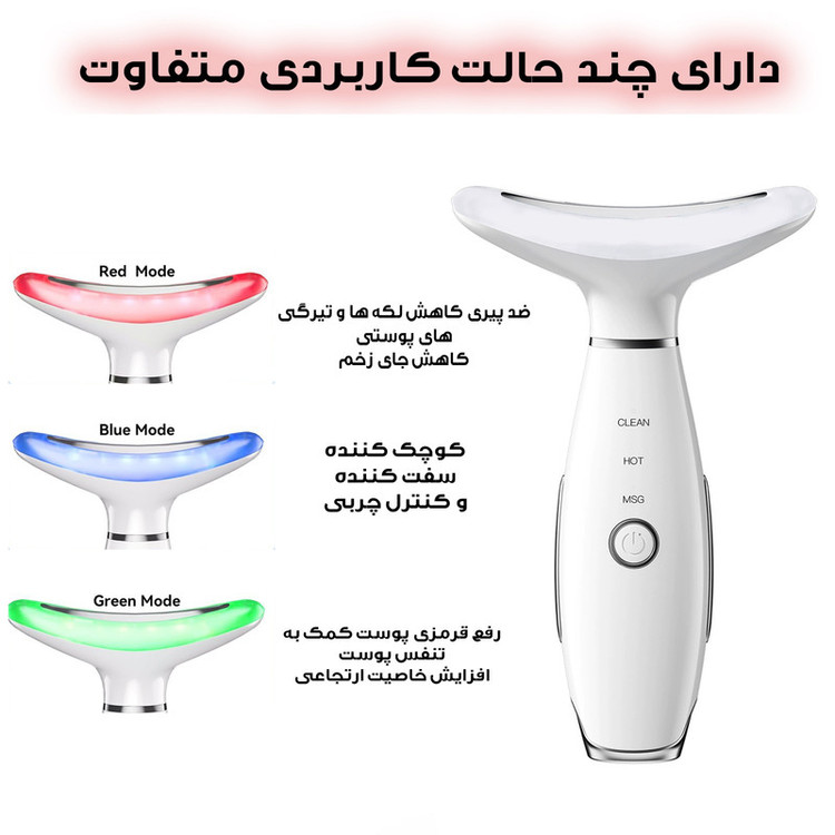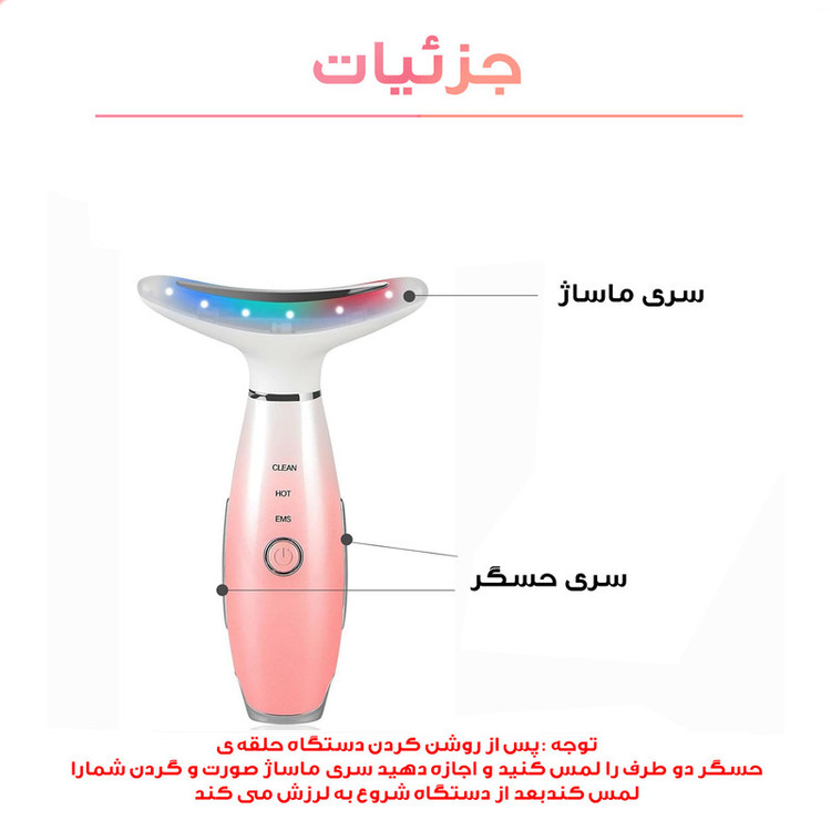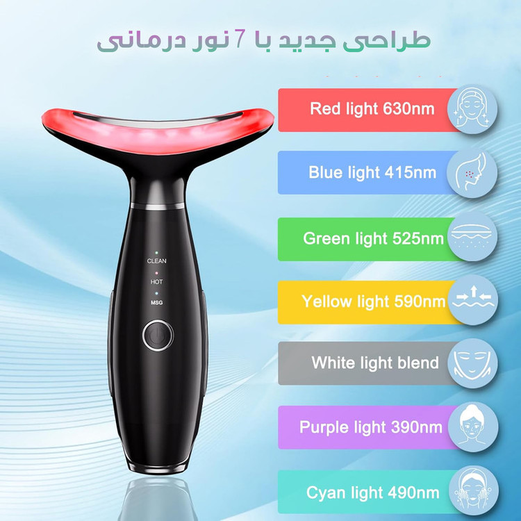 **مناسب برای نواحی مختلف صورت:** - از چانه تا سیب گودی - از گونه تا زیر چشم - از پایین پیشانی تا بالا - و سایر نواحی حساس دارای 7 نور درمانی باتری : 3.7 ولت / توان نامی : 2.5 وات / ولتاژ شارژر : 5 ولت و 1A