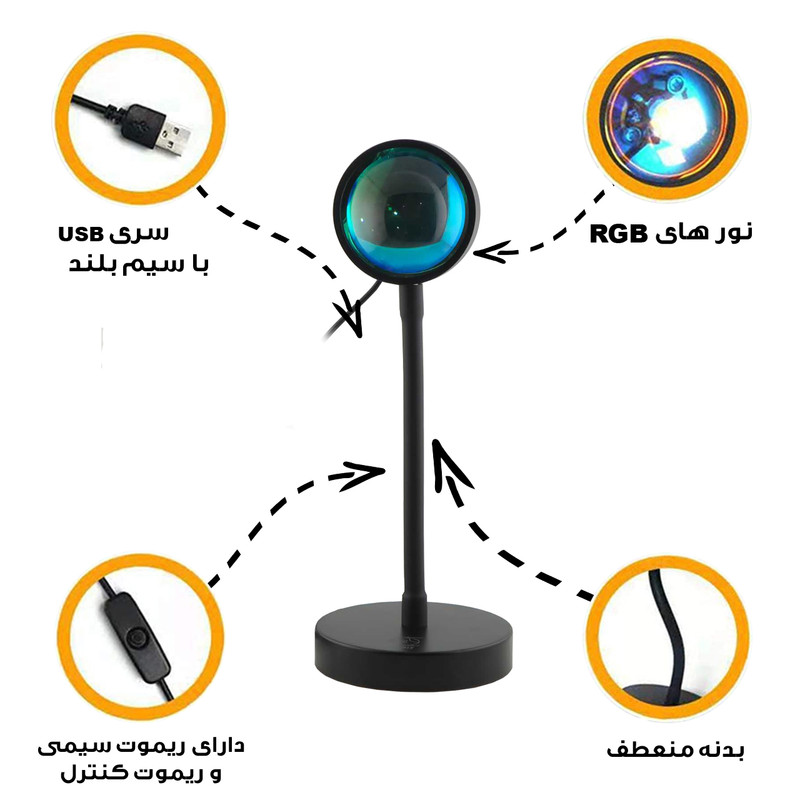 چراغ یا پروژکتور غروب خورشید نوعی گجت پرفروش نور پردازی که با نام sunset lamp ترند شده است با این گجت جذاب میتوانید، عکس های پرتره ی متفاوت و شگفت انگیز بگیرید و توی شبکه های اجتماعی خاص باشید و اگر خانه ای مدرن و زیبا دارید، به جذابیت خانه اضافه کنید. این چراغ زیبا می تواند هدیه ی جذابی برای عزیزانتان باشد و همینطور سرگرمی جالبی برای کودکان ویژگی ها: چراغ غروب خورشید با بدنه و پایه از جنس آلومینیوم با کیفیت ساخته شده ، قسمت سری لامپ از جنس شیشه و حالت کریستال مانند داره که قابلیت چرخش 180 درجه در محور عمودی را دارد واین امکان را میدهد که به سمت سقف یا دیوار بچرخانید . با سیم حدود 120 سانتی که از یک طرف به سری لامپ و از طرف دیگر حالت یو اس بی دارد، به 5 ولت برق نیاز دارد و برای استفاده باید به شارژر گوشی یا هر منبع تغذیه 5 ولتی وصل شود. برای کنترل چراغ یک عدد ریموت کنترل که به راحتی این امکان رو میده تا از راه دور انواع رنگ های جذاب رو تنظیم کنید.