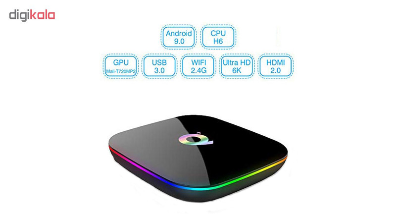 محصول Q plus یک اندروید باکس است برای هوشمند سازی تلویزیون که با حافظه ی ذخیره سازی 32 گیگابایت eMMC پرسرعت نسل جدید با قابلیت نصب تعداد زیادی اپلیکیشن، بازی و برنامه های کاربردی و همچنین ذخیره سازی حجم قابل توجهی عکس، فیلم و موسیقی، حافظه ی سیستمی 4 گیگابایتی DDR3 و ظاهری بسیار زیبا به رنگ مشکی (به همراه ال ای دی های رنگارنگ که دور تا دور محصول را مانند رنگین کمان زیبا کرده اند)، وزن و ابعاد مناسب، طراحی شده است. این محصول دارای سیستم عامل اندروید 9.0، پردازشگر مرکزی قوی Allwinner new H6 quad-core high-end master chip، پردازنده گرافیکی پر سرعت Mali T720 MP2، پورت شبکه LAN، شبکه وایرلس Dual band (2.4GHz/5.8GHz) IEEE 802.11a/b/g/n، درگاه USB 3.0، بلوتوث 4، پورت بسیار پر سرعت HDMI 2.1، پشتیبانی از محتوای تصویری و گرافیکی شگفت انگیز محتوای تصویری و گرافیکی 4K UHD@60fps, H.265 و 6K@30fps به لطف موتور پردازشی Allwinner Phoenix 3.0 VE می باشد. در این اندروید باکس به سادگی، با اتصال گوشی و یا تبلت اندرویدی و یا اپل به همان شبکه وایرلسی که این اندروید باکس به آن متصل می باشد، می توان محتوای تصویری و ویدیویی موبایل و یا تبلت را بر روی صفحه های نمایش بزرگ تلویزیون به صورت وایرلس مشاهده کرد. استفاده از این قابلیت مستلزم نصب اپ های مورد نیاز و یا فعال سازی مجوزهای استفاده توسط کاربر می باشد. از دیگر ویژگی های این محصول، پشتیبانی از فرمت HDR (گستره دینامیکی بالا) در نمایش تصاویر ویدئویی می باشد. این فرمت، تصاویری واقعی تر با عمق رنگ بیشتر ایجاد می کند. در این اندروید باکس همچنین با استفاده از تکنولوژی محدوده رنگ گسترده تر با پشتیبانی از عمق رنگ 10 بیتی به ازای هر رنگ در راستای ایجاد تصاویر با طیف رنگ عالی و سایه روشن های طبیعی به همراه انتقال روان تر نمایش رنگ ها از طیف روشن به تیره، تصاویری خارق العاده خلق می شود. این محصول ابزاری بسیار مناسب برای هوشمند سازی تلویزیون به شمار می آید. این اندروید باکس حتی برای مقاصد گیمینگ نیز گزینه ی مناسبی می باشد.