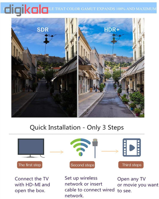 به لطف پورت HTMI 2 و CPU چهارهسته ای 64 بیتی میتواند تصاویر 3D و فایل های ISO 3D را با کیفیت های 4K و 6K برای شما به نمایش درآورد و با رنگ های بسیار زنده و شفافی که دارد شما را به وجد آورد.