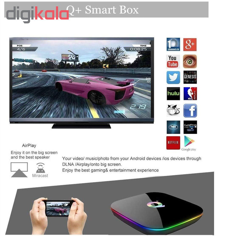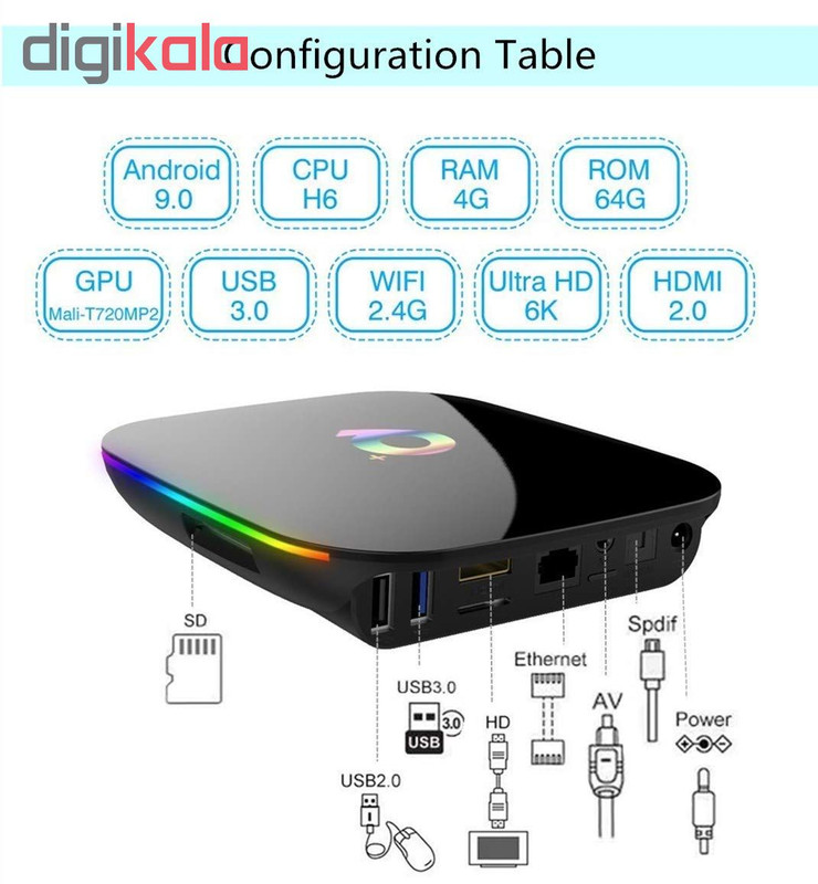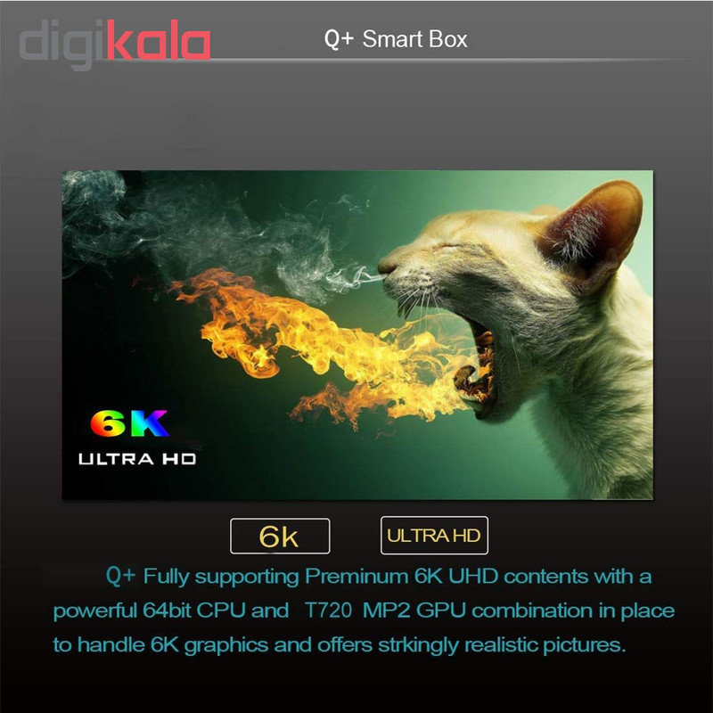 اندروید باکس Q plus دارای پردازشگر H6 Quad core cortex-A53 frequency 2G و پردازشگر گرافیکی Mali-T720MP2 که میتواند فیلم ها و بازی های شما را با کیفیت 6K به شما نمایش دهد.