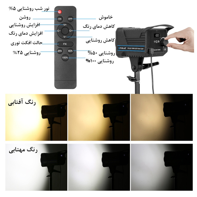 کافی است آن ها را به برق متصل کنید و کلید آن را روشن کنید.دمای رنگ این نور متغیر بوده و می توان از 3200 تا 5600 کلوین به صورت تدریجی آن را تغییر داد.و مهم تر آن که شاخص رنگ این نور >97 است به این معنی که رنگ های محیطی را تا حد زیادی نزدیک به واقعیت ثبت می کند.دیمر پشت دستگاه نیز به تنظیم قدرت خروجی نور از 1 تا 100 درصد کمک می کند.مانت اتصال شکل دهنده های نوری این مدل از نوع استاندارد بوئنز است.به همین جهت هیچ گونه محدودیتی در اتصال تجهیزاتی همچون کاسه، سافت باکس، اکتاباکس و دیگر تجهیزات استاندارد ندارید.به کمک صفحه نمایشگر موجود روی پنل پشتی می توانید تنظیمات نوری را کنترل کنید شیارهای موجود در نور Puluz به خنک نگه داشتن دستگاه حین استفاده های طولانی مدت کمک می کند.در محل پایه اتصال نور به سه پایه محفظه ای مناسب استفاده انواع چتر های نورپردازی وجود دارد تا بتوانید به کمک آن از انعکاس نور و چتر استفاده کنید.ریموت کنترل همراه نور پلوز به شما این امکان را می دهد تا تنظیمات نوری اعم از خاموش و روشن کردن دستگاه و تنظیم قدرت خروجی نور از 100-1 درصد ، کلوین و همچنین افکت های نوری همچون رعد و برق ، آتش نشانی ، چشمک زن و ... را از راه دور کنترل کنید.
