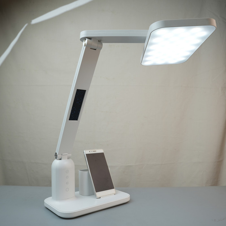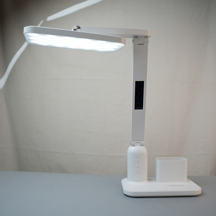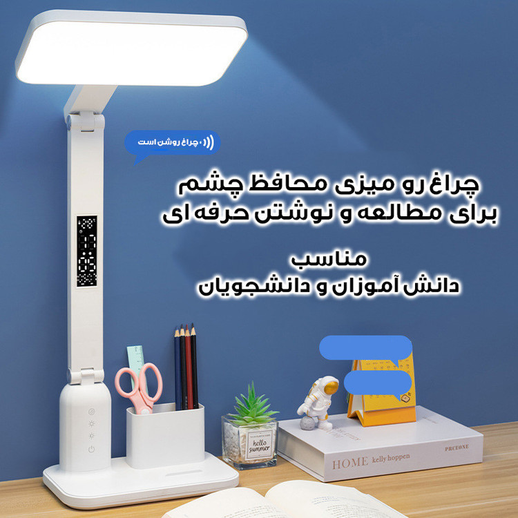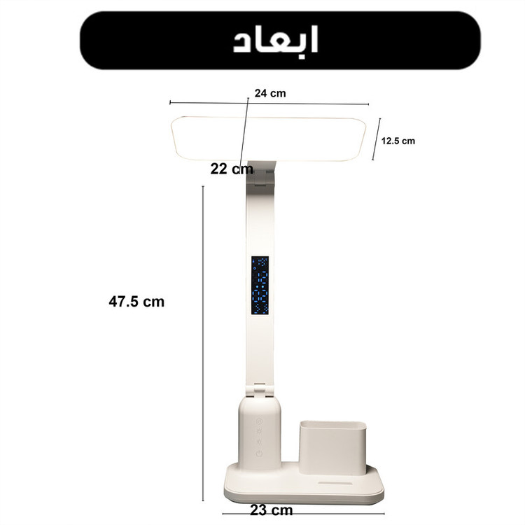 باطری داخلی قابل شارژ ، دارای 3 نور افتابی مهتابی و ترکیبی ، قابلیت تنظیم شدت نور ، قابل استفاده هنگام شارژ ، توان 14 وات ، صفحه نمایش دیجیتال ، قابلیت هولدر موبایل و جا مدادی