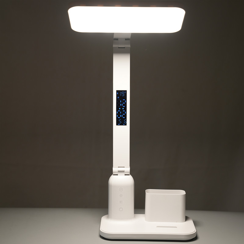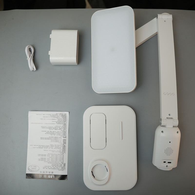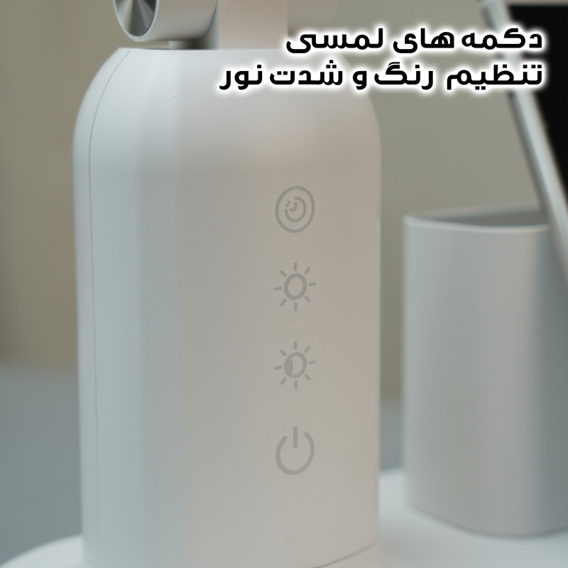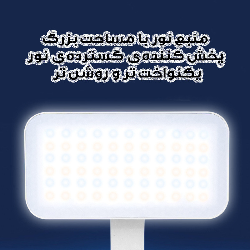باطری داخلی قابل شارژ ، دارای 3 نور افتابی مهتابی و ترکیبی ، قابلیت تنظیم شدت نور ، قابل استفاده هنگام شارژ ، توان 14 وات ، صفحه نمایش دیجیتال ، قابلیت هولدر موبایل و جا مدادی