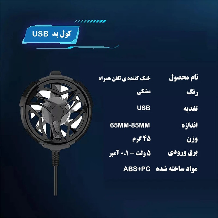 مشخصات: - دارای فن 7 پر - کابل به طول 90 سانتیمتر - سوکت USB