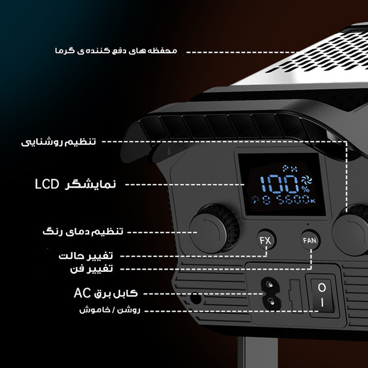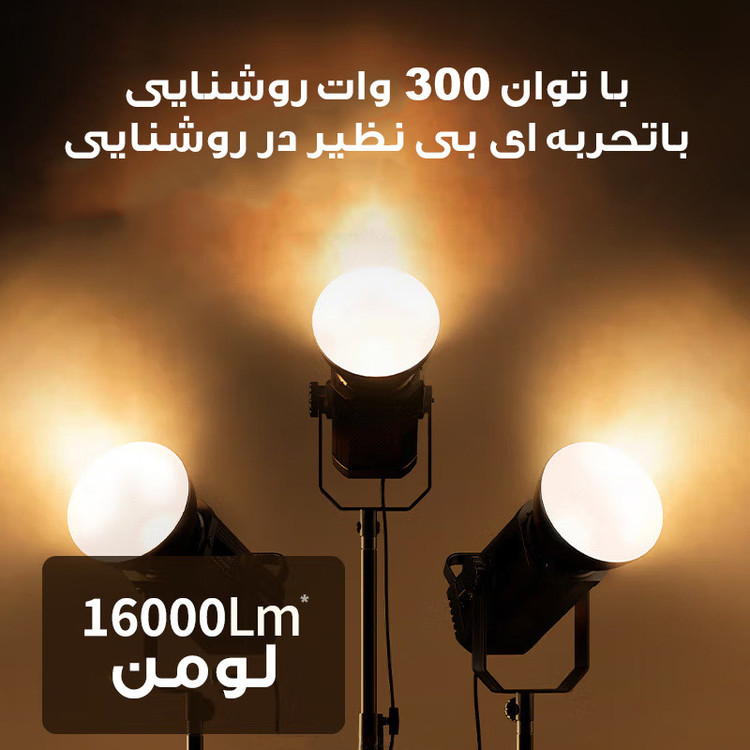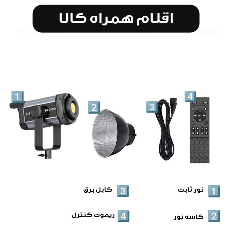 قابلیت تنظیم شدت نور ، دارای ریموت کنترل ، قابلیت تنظیم زاویه اقلام همراه کالا : نور به همراه کاسه ی نور استاندارد ، کابل و کنترل RA95+ ,