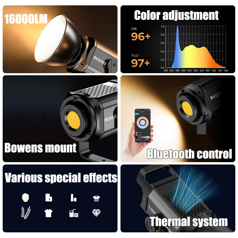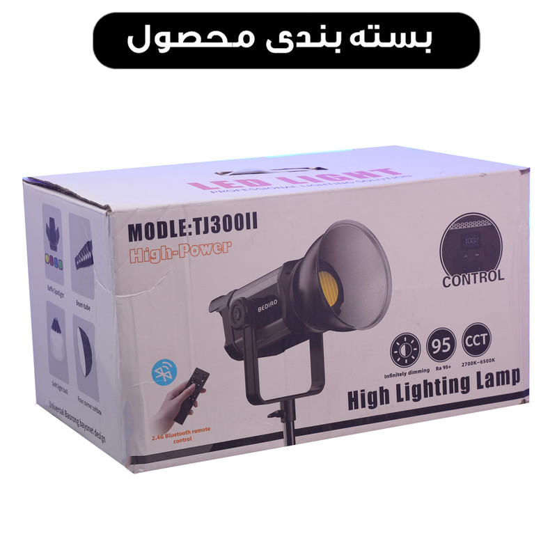 قابلیت تنظیم شدت نور ، دارای ریموت کنترل ، قابلیت تنظیم زاویه اقلام همراه کالا : نور به همراه کاسه ی نور استاندارد ، کابل و کنترل RA95+ ,