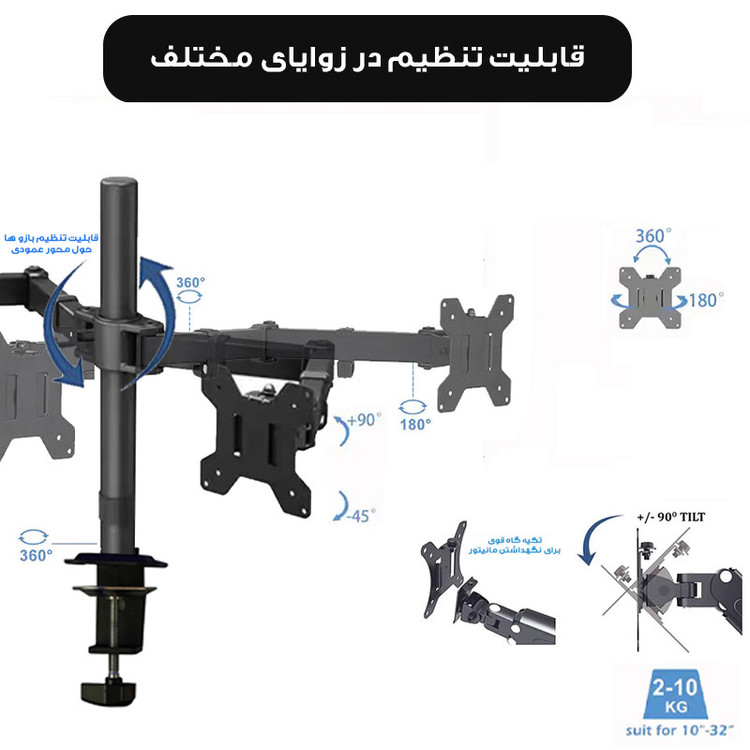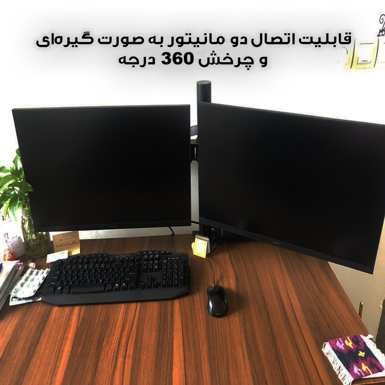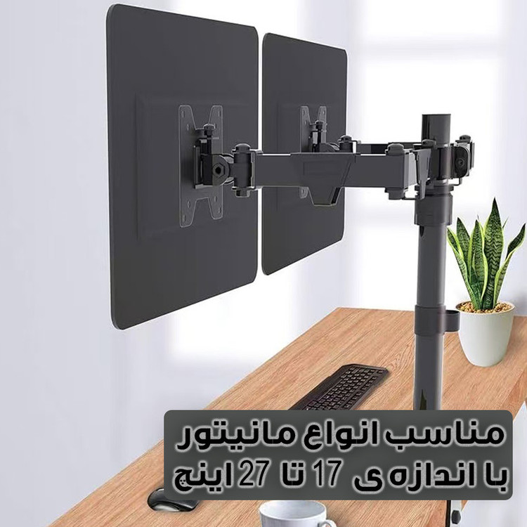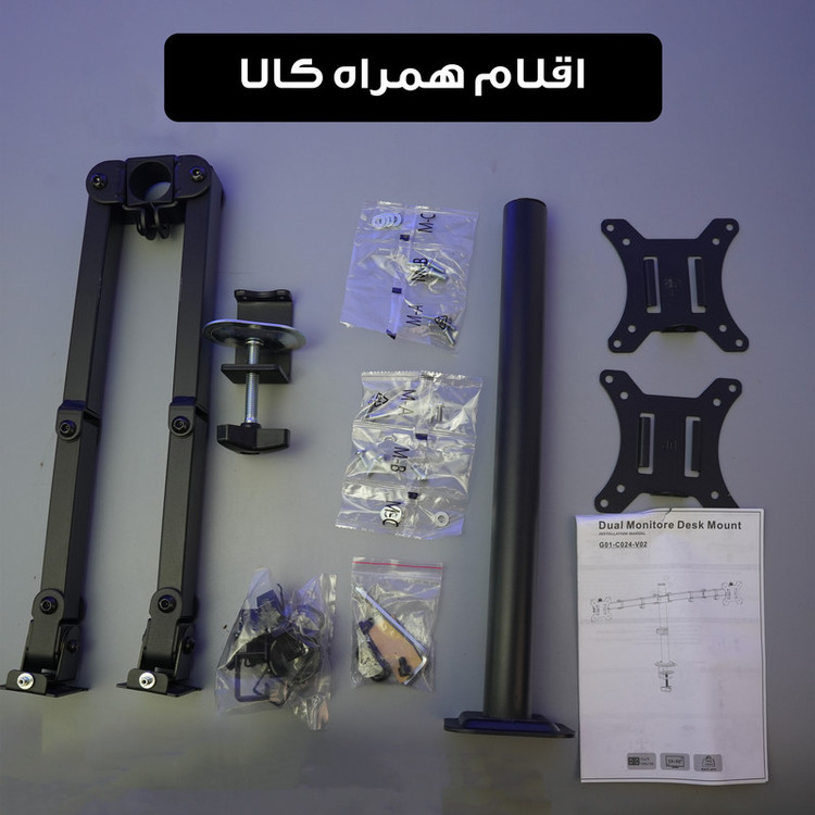 سایر توضیحات: قابلیت اتصال دو مانیتور ، قابلیت تنظیم ارتفاع ، قابلیت چرخش ۳۶۰ درجه ، مناسب انواع مانیتور مناسب مانیتورهای تا 20 اینچ اقلام همراه کالا : دو هلدر اتصال به پایه های فلزی ، الن ،پیچ ، گیره اتصال به لبه ی سطوح