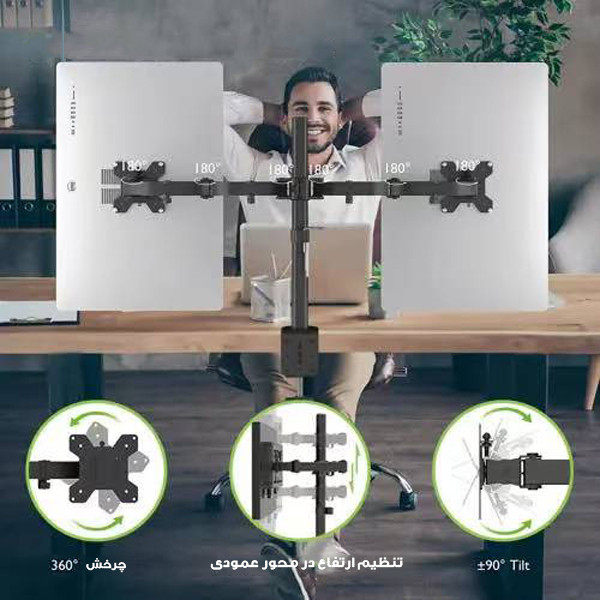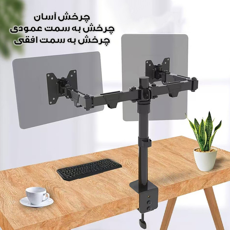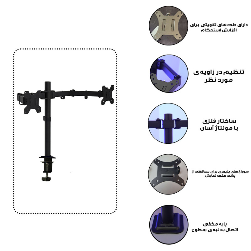 سایر توضیحات: قابلیت اتصال دو مانیتور ، قابلیت تنظیم ارتفاع ، قابلیت چرخش ۳۶۰ درجه ، مناسب انواع مانیتور مناسب مانیتورهای تا 20 اینچ اقلام همراه کالا : دو هلدر اتصال به پایه های فلزی ، الن ،پیچ ، گیره اتصال به لبه ی سطوح